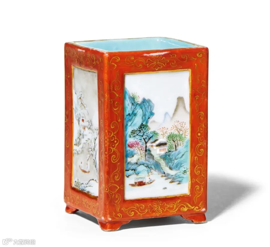 LOT869 清乾隆 粉彩矾红地开光粉彩山水纹笔筒