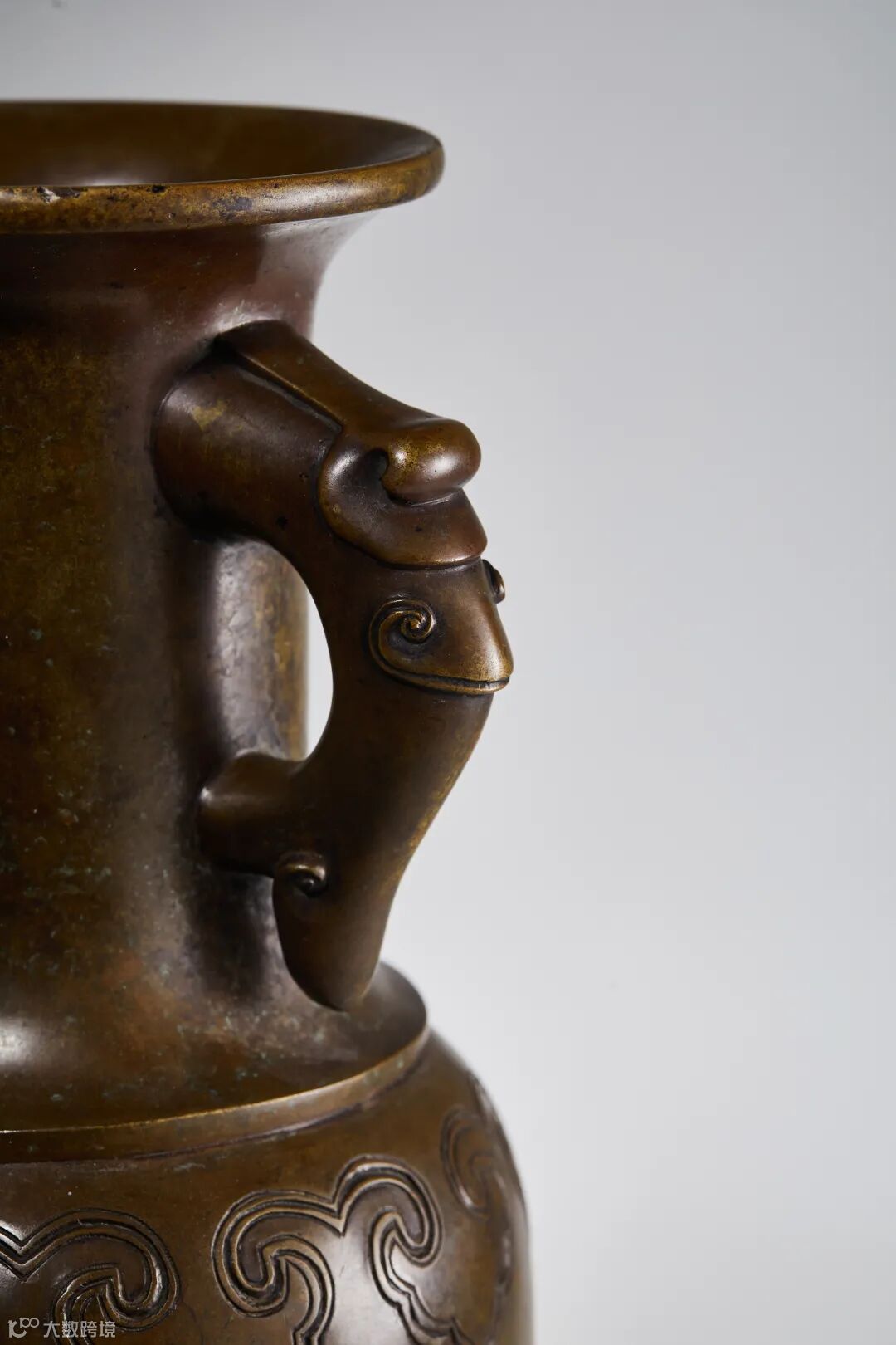 此件铜雪花金龙耳如意纹瓶铜质颇为细腻,观其色倾黄,饱满匀亮,蕴涵金星点点,闪烁如黄金般璀璨之光泽,细碎的雪花闪耀其间,映出迷人光泽,令人观而忘俗。整器盘口,溜肩,球形腹,圈足外撇。腹部雕琢云纹,刻划细腻生动,足部置双龙耳,仿上古青铜纹饰,简约庄重,纯朴内敛,别具特色。整器造型端穆,体表多呈光素之态,唯以双龙耳与如意云纹为饰,熔铸规整,精气内敛,静而不嚣,线条自然,在幽静凝重的氛围下难掩尊贵不凡的气质,为清代早期瓶中之殊异者,值得珍视。