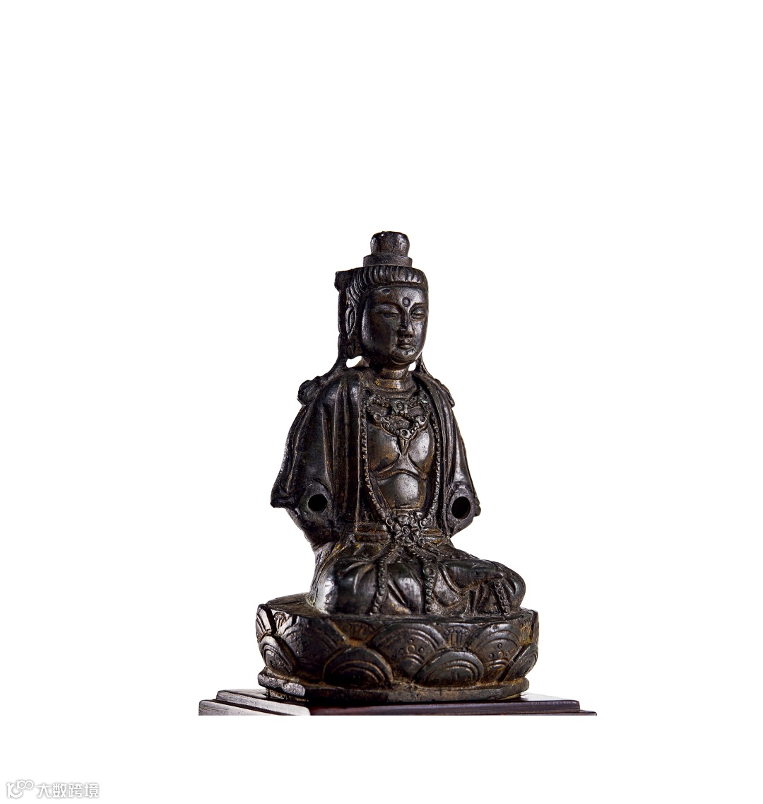 此尊观音坐像具有鲜明的辽代的造像风格,造型生动古朴,以精铜熔铸为材,头束高发髻,面相祥和,饱满圆润,双目低垂,嘴角内含,眉目婉好,给人慈祥之感。躯体敦厚,体态匀称,线条柔美有力。身披繁美璎珞,自然垂于莲台,观音跏趺坐大莲座上,莲瓣错落堆叠,排列有致,足可见工艺之精湛考究,使造像显得格外高贵典雅。两臂与身躯分铸,故易脱落散失但在岁月洗礼之中,此般损失在所难免,并不能损其艺术价值。此像将观音端庄娴雅之形象表现得淋漓尽致,极富神韵,集中体现了“崇雅反俗”的高度审美意趣,在著名文物专家、收藏价王世襄先生收藏品汇集——《王世襄集》中亦有同款观音坐像记载于册,可谓难得,也恰恰证明了此尊造像非同一般,可堪珍视入藏。