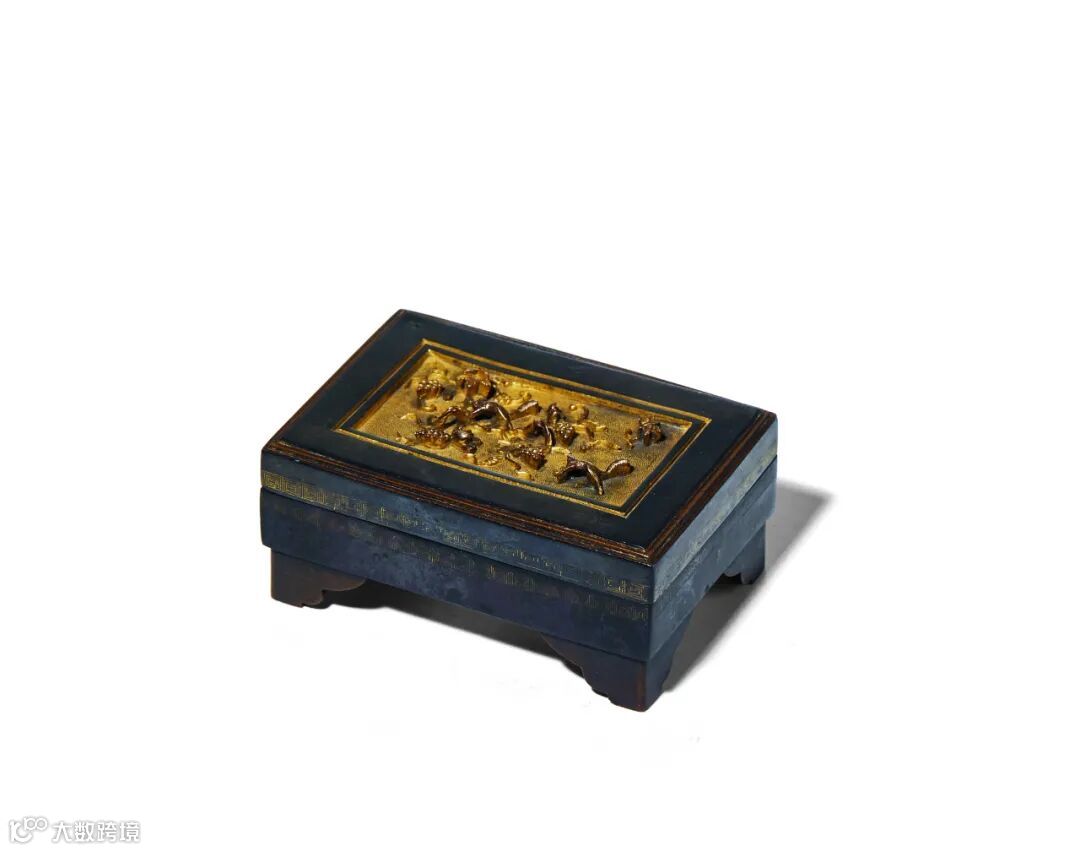古时所焚之香,均以香片制成香屑,故必以盒贮之以作备用。此件四方香盒采用铜鎏金工艺,历经岁月洗礼,金水仍莹亮厚重,雍容华贵,为典型的清乾隆造办处风格。其上“松鼠偷葡萄”题材为我国传统吉祥纹饰之一,其以籽实繁多的葡萄象征家族人丁兴旺。画面中,葡萄树高大茂盛,藤叶浓密,成串的葡萄摇摇欲坠,在浓密的葡萄叶间,两只松鼠在蔓间欢快地跳跃着,蜂、蝶在硕果间飞舞,灵动自然,寓意“捷报丰收”。整器造型别致,纹饰琢刻精到,寓意美好,颇具雅意,为同类四方香盒中之妙品。