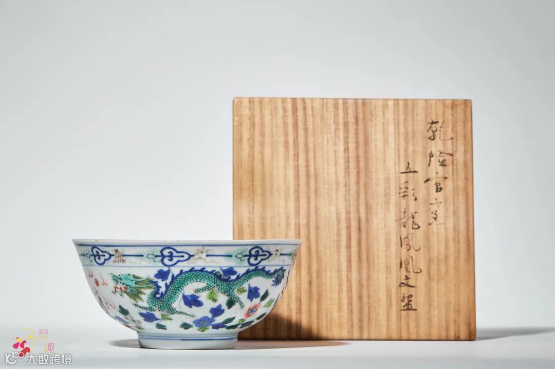 拍品侈口,深腹,圈足,碗心绘矾红五爪龙纹,外壁近口沿处饰八宝吉祥如意纹。碗腹主体通景描绘龙凤穿梭于花海之间,其间芙蓉、雏菊等各色花朵遍生其旁,二龙姿态矫健,凤凰色泽明亮,构图疏朗,极富张力。胎质紧密洁白,釉质肥滋,五彩画面娇艳可人,色彩浓淡不一,构成了一幅五光十色的“龙凤呈祥”图,圈足底书青花“大清乾隆年制”六字三行篆书款。