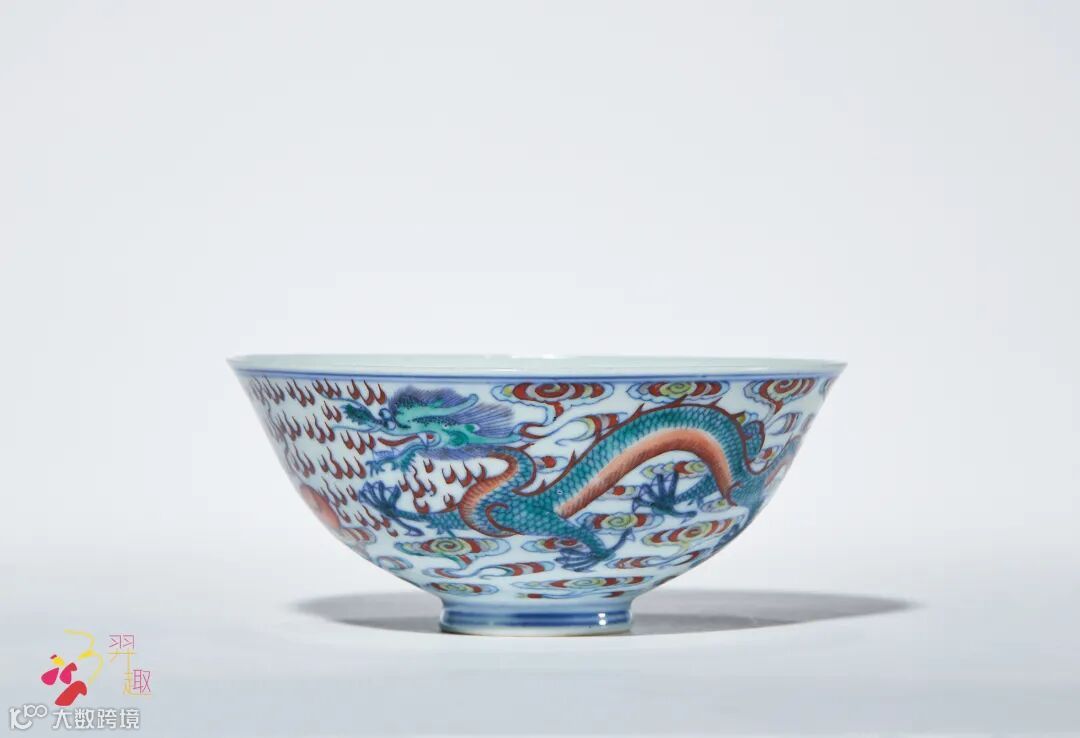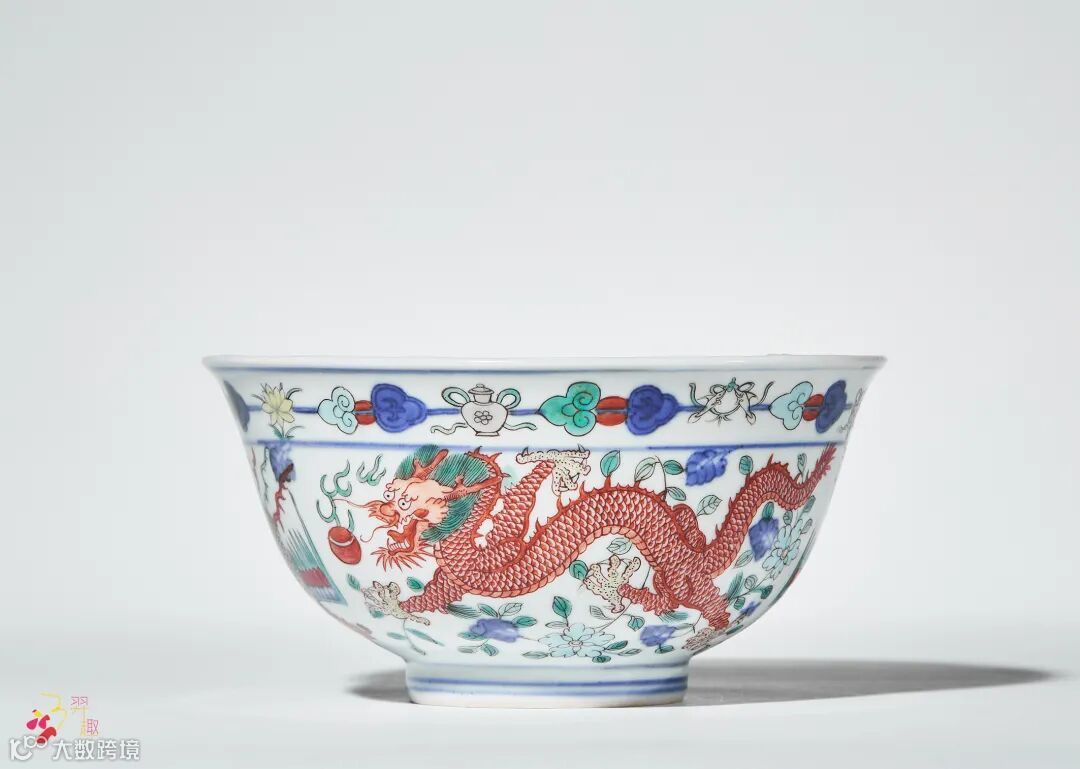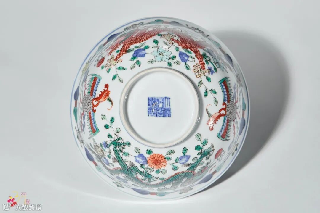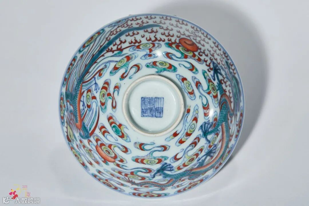 拍品撇口,弧腹,圈足。碗外壁以斗彩绘龙凤纹,祥云密布,缭绕如烟,行龙赶珠穿行,瞠目张吻,须发飘逸,躯干遒劲有力,五爪锋利如轮,龙鳞排布细密有序,一丝不乱,周身火焰灼灼,风驰电掣,凛凛威仪,令人敬畏。另一侧凤凰傲然穿行,翎毛整齐细密,婉转婀娜,繁复华丽。凤凰于飞,翙翙其羽,体态优美,凤尾迤逦,气势威仪,神采飞扬,神姿凛然,令人目眩心折。龙凤皆绘制精细,鬃发翎羽刻画细腻,凤鸟展翅,羽冠秀逸,苍龙威猛,五爪刚劲。龙凤姿态凶猛优美,对比强烈,和美得谐,构成“龙凤呈祥”之吉寓,喜庆吉祥,装饰效果极强。