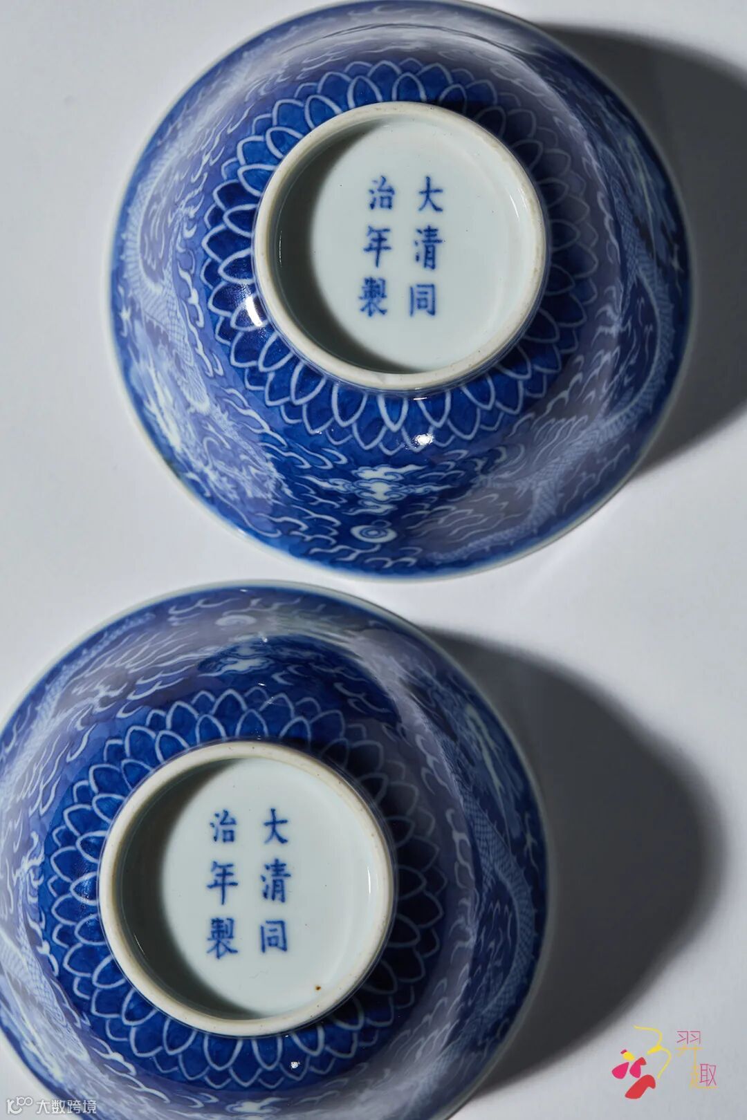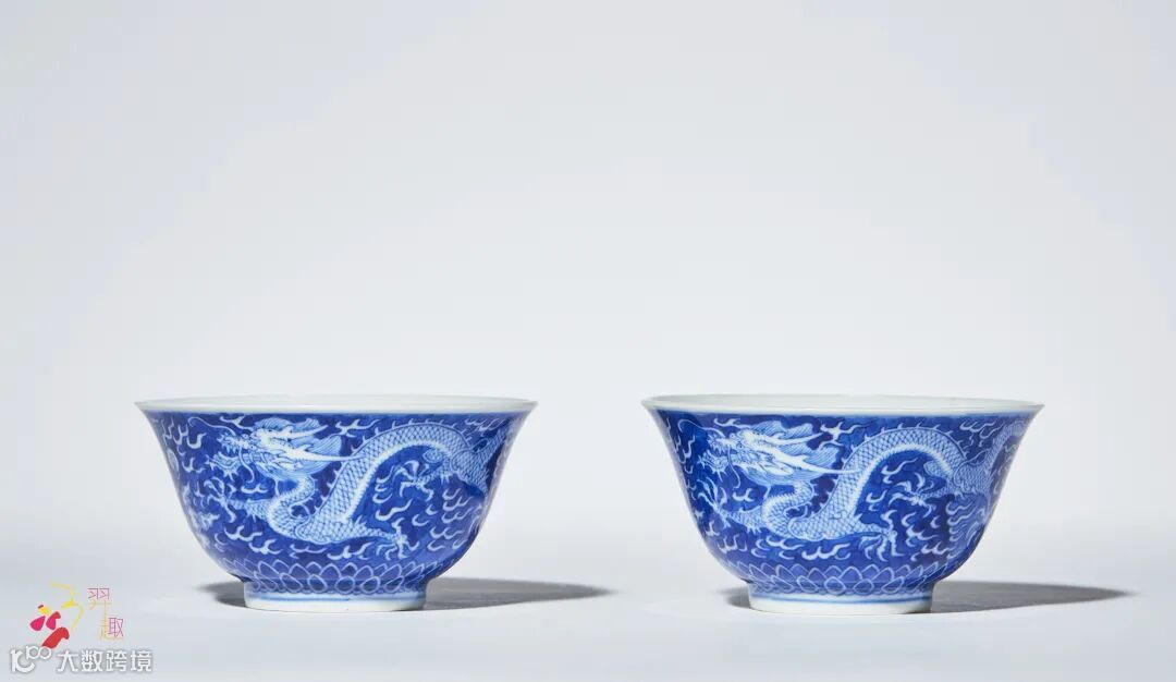 此对拍品撇口,深弧腹,圈足。碗里绘云龙戏珠纹,外腹部饰蓝地留白青花云龙纹,青花发色浓艳,云龙繁缛,细条流畅。胫部绘多重莲瓣纹,立体感强。此碗造型端庄,画意华丽优美。蓝地白花装饰,在元代就已出现,到明清时运用更加成熟。蓝白相映,使纹饰更加鲜明生动。此对碗在蓝底白花基础上以青花绘纹饰,装饰复杂细致,工艺精湛绝伦。