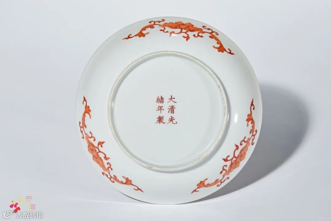 此矾红彩云龙纹盘盘形规整,内壁矾红彩绘四组立龙赶珠纹,中间绘火焰纹饰,外壁绘三组折枝花卉纹,底矾红彩书“大清光绪年制”六字双行楷书款。