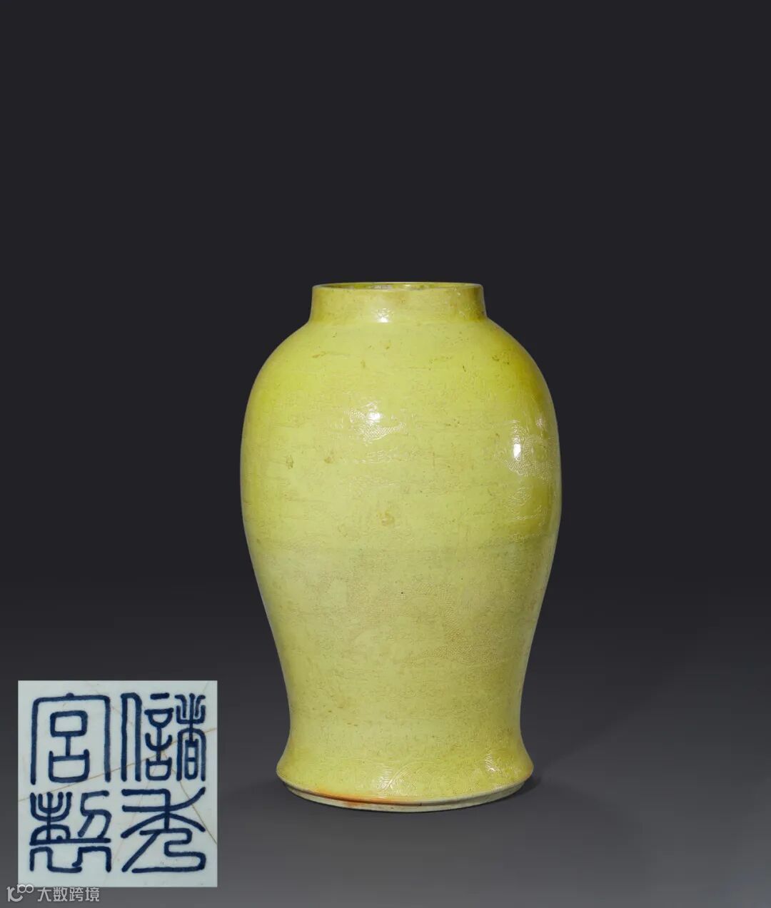 拍品直口,短颈,丰肩,收腹撇足,形制古雅。通体施黄釉,釉下暗刻云龙纹。器形端庄挺拔,刻工精细流畅,所刻龙纹栩栩如生,或在云中上下翻腾,或回首顾盼,充分体现了皇室的尊贵与威严,是晚清时期大型瓷器的杰出代表。瓷器上纯正的黄釉始烧于明永乐年间,一直是明清宫廷的主要用瓷,据《国朝宫史》记载:“只有皇帝、皇太后、皇后可配享纯黄釉瓷器,皇贵妃用里白外黄瓷外,任何人不得僭越。” 底部施白釉,青花书“储秀宫制”四字二行篆书款,表明此罐是景德镇御窑厂特为清宫“储秀宫”烧制的器皿,确为旧时宫中遗物。