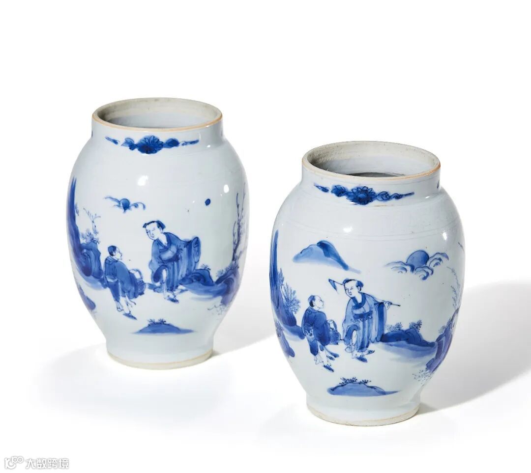 LOT157 明崇祯 青花人物故事纹莲子罐一对