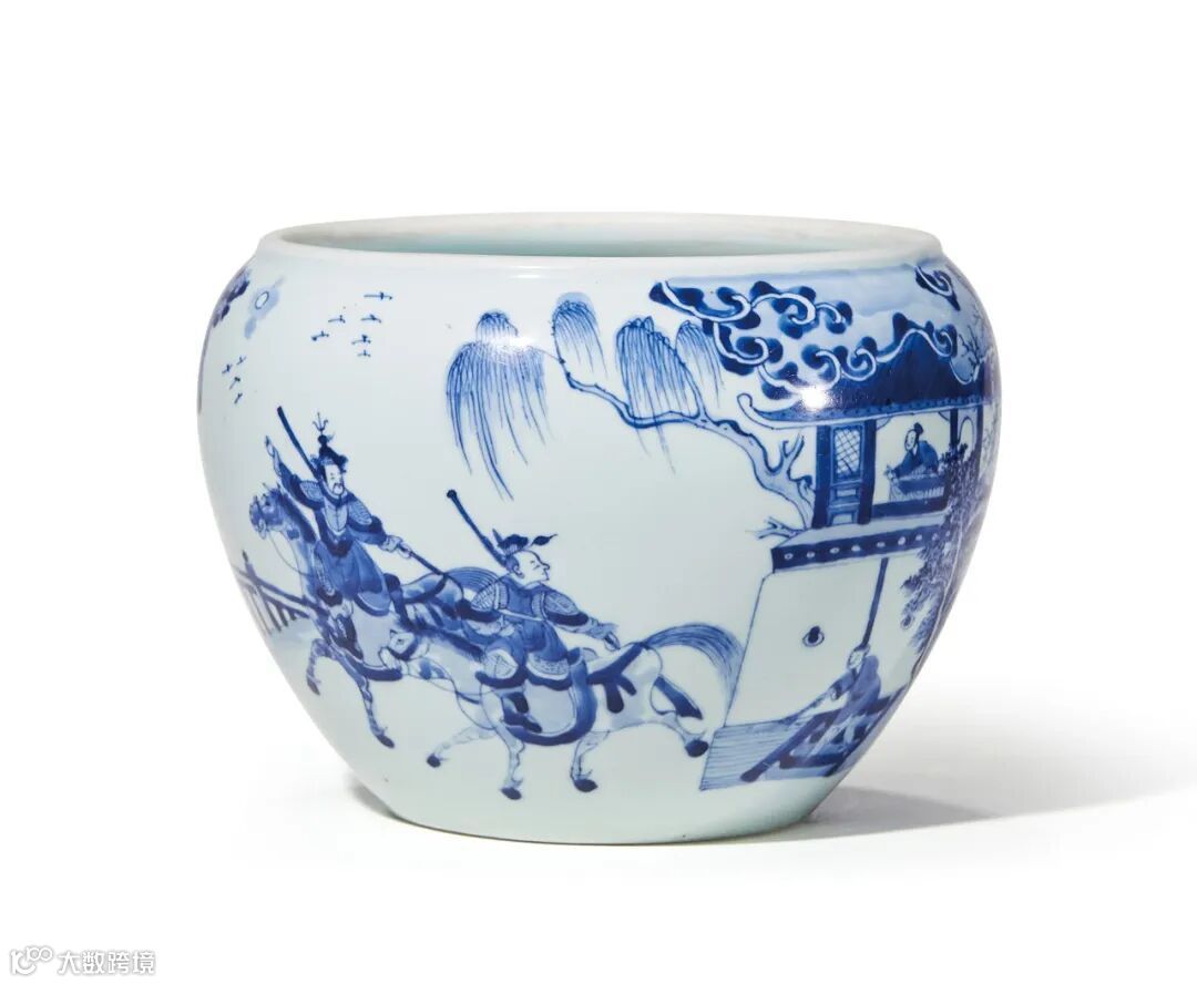 以刀马人为主题纹样的装饰在清代瓷器上尤为流行,其情节大多为《三国演义》、《水浒传》中的故事,画面多取材於当时流传的戏曲版画,拍品所绘即为其中一例。