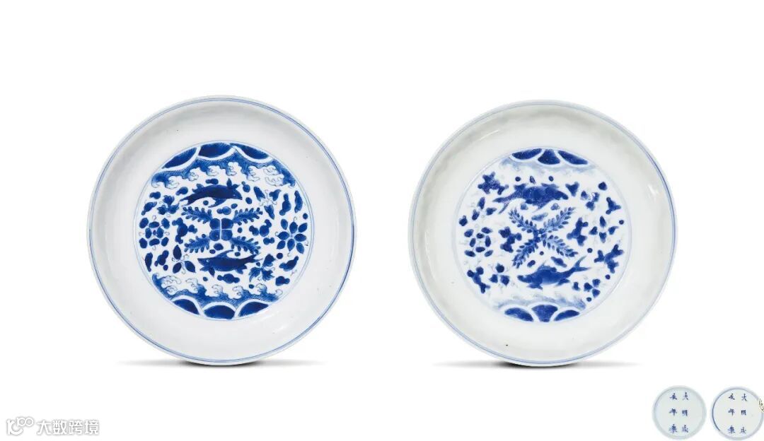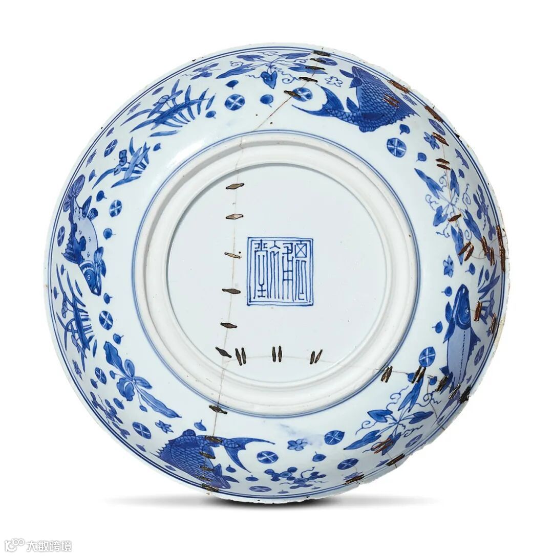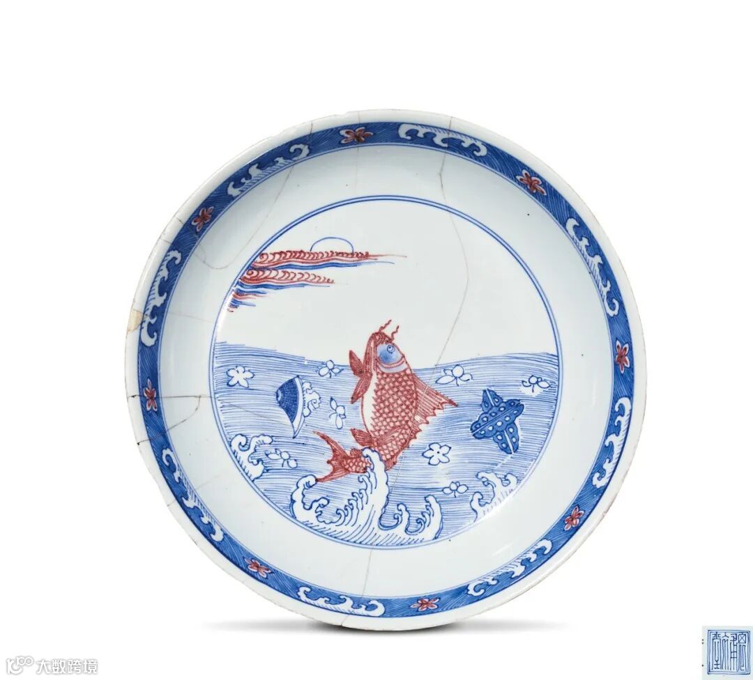 拍品撇口。弧腹,双圈足。呈色鲜艳,盘心以青花线描海水纹,以釉里红绘鱼身,鱼形肥硕劲健、腾跃灵动、动感强烈、形神具佳;外壁则通以青花釉里红满绘鱼藻纹。此盘画面描绘细腻,蓝、红二色醒目亮丽。青花浓淡相间发色沈稳,釉里红鲜艳纯正,发色成熟稳定。