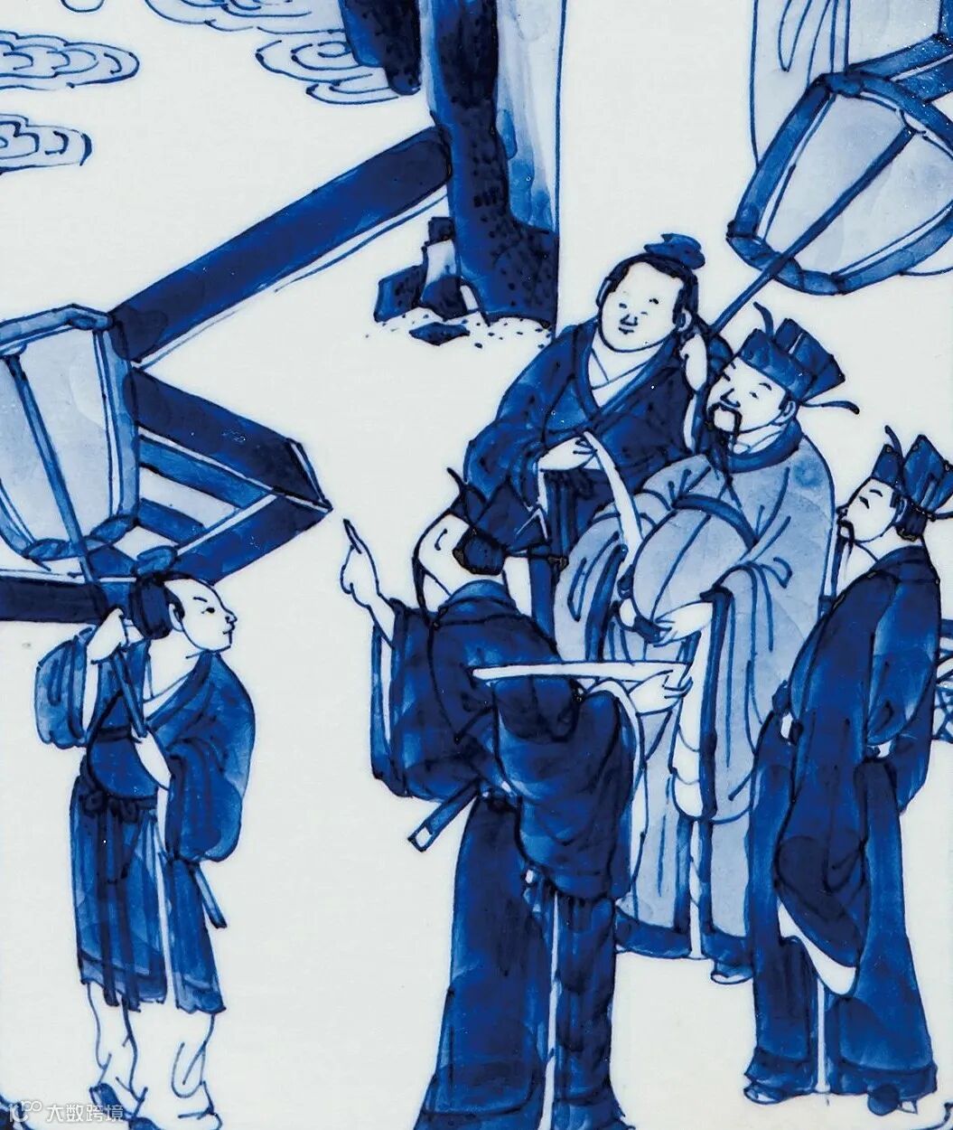 拍品造型周正,胎质洁白细腻,通体施透明釉,釉面莹润光泽,腹部以青花装饰绘“空城计”人物故事图,诸葛亮稳坐城楼,城门洞开,一小童悠闲扫地,对面司马懿大军迟疑欲退,绘画表现淋漓尽致。人物衣衫飘逸有致,神态形象生动,笔触细腻流畅,设色淡雅柔和,为难得一见的康熙青花瓷器精品。