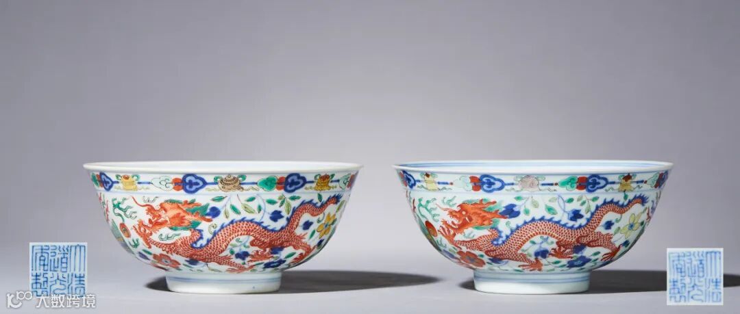 拍品侈口,弧腹较深,圈足。胎质细腻,釉质润泽,釉面匀净。碗内底以红彩绘出五爪龙戏宝珠图案,龙身周边青焰围绕,碗外部近口沿处以紫、黄、绿彩绘一周八宝纹,以青花五彩绘出双龙双凤,基本呈中心对称,双龙主体颜色分别以红、绿彩绘出,双凤振翅凤首朝下,龙凤身边装饰以缠枝花卉,精美绝伦。龙凤成双成对,寓意吉祥。此类碗始见自康熙朝,后成官窑经典器型,每朝必烧,两百年来造型、纹样基本保持不变。拍品成对保存至今,尤为难得。
