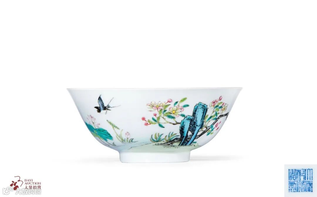 杏花朵朵、洞石苍雅,展示出“杏子梢头香蕾破,淡红褪白胭脂涴”婀娜的风情、艳丽的芬芳。著名才子唐寅曾写过“燕子归来杏于花,红桥低影绿池斜”的诗句,诗中所描绘场景与拍品所展现的景象极为相似,燕过杏花间,碧水池中绿影斜斜,一派春意浓浓。而对“杏林春燕”还有另外一种解释,来自于科举制度。因为殿试之期怡逢杏花盛开,以杏花喻意殿试之期,天子会赐宴接见众学子,“燕”有谐音“宴”之意,“杏林”象征有幸上榜者,当“杏”与“燕”同时出现,故有金榜题名和出席御宴的寓意。而皇室御用瓷器上出现此图,更有开科取士、求贤若渴之意。