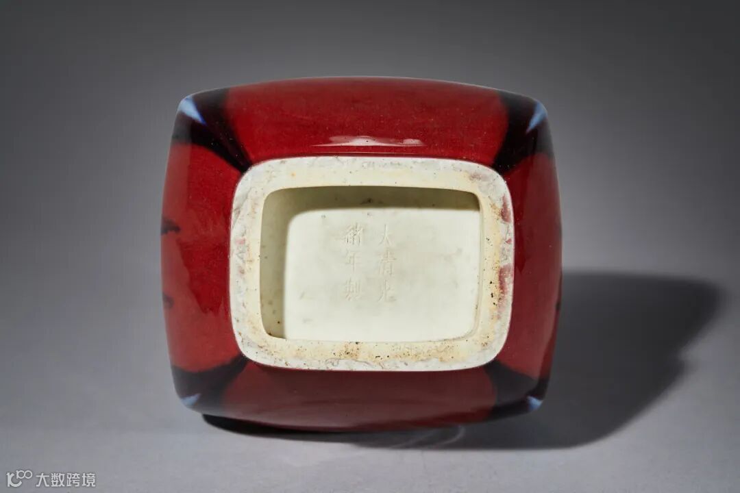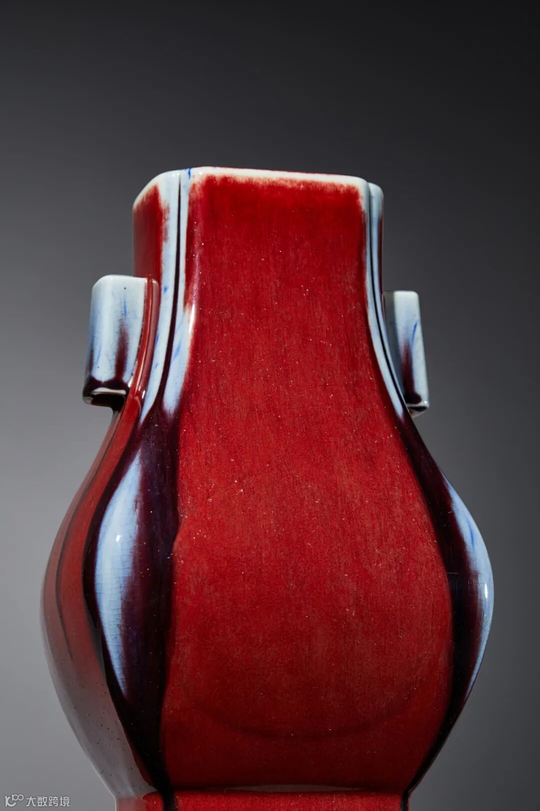 此拍品口沿呈海棠形,颈部两侧饰贯耳,腹部下垂,两面分饰桃形凸起,下承圈足,整器造型端庄挺拔、古朴大气。瓶通体施窑变釉,釉汁肥厚斑斓。窑变釉是一种以铜红釉为主,并添加多种金属元素烧制而成的高温釉,为唐英督理景德镇御窑厂时仿钧窑釉色所繁衍出的一个创新品种。借用唐诗来赞美窑变釉恰如其分,“高山云雾霞一朵,烟光空中星满天,峡峪飞瀑兔丝缕,夕阳紫翠忽成岚”。贯耳瓶是窑变釉器物的典型造型之一,自乾隆至清代晚期均有烧造。