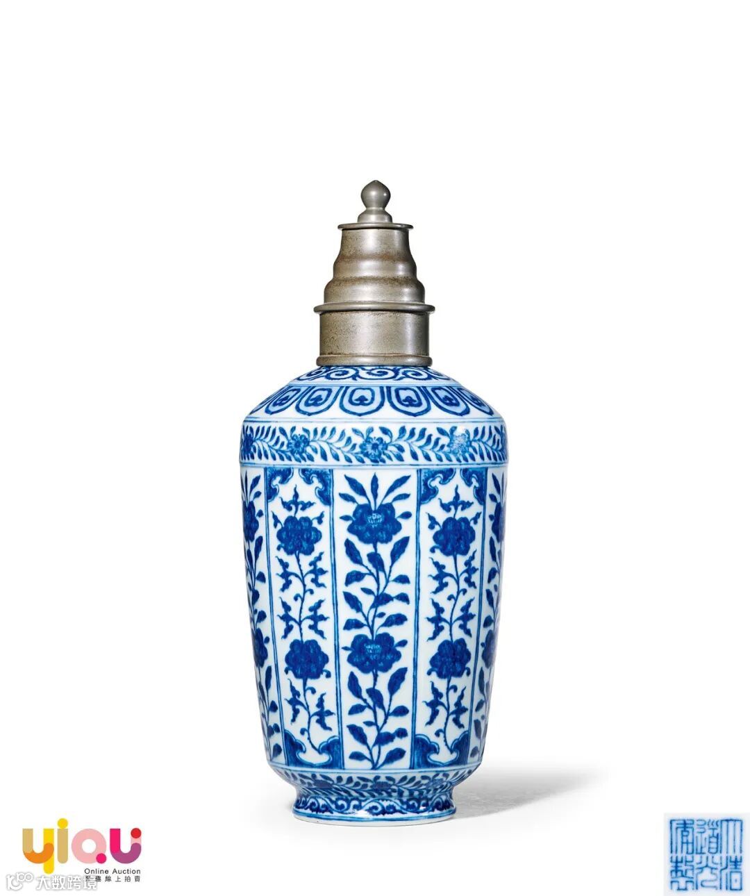 值得注意的是拍品的锡制器盖,此盖造型与收藏于台北故宫博物院的一对青花盖罐之锡制器盖极为近似,均作宝珠形钮,可为参阅。