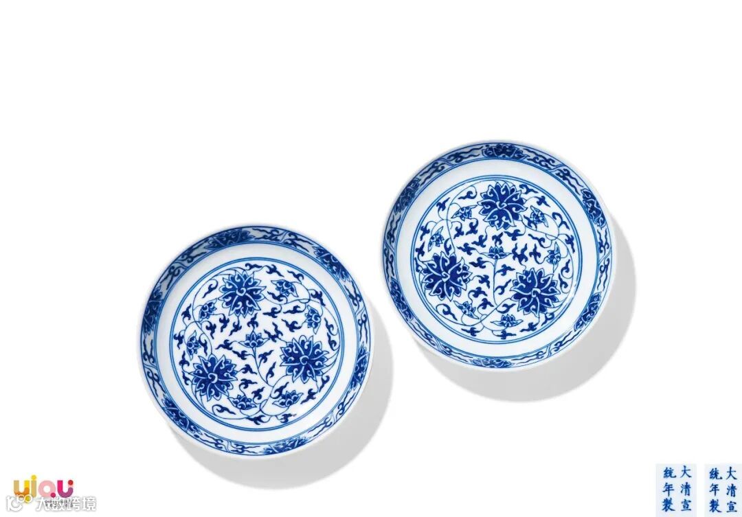 此对拍品为清代御窑传统制式,器型规整,胎质细腻坚硬,盘心绘缠枝莲花,边饰及盘外壁皆同。青花发色艳丽,构图舒朗有致,纹饰绘工流畅,为宣统朝烧造精美的青花作品。