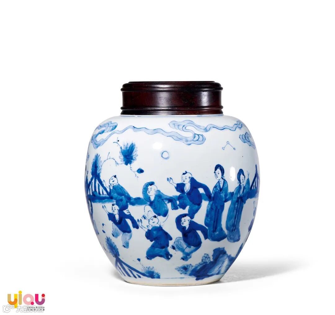 拍品直口,丰肩,鼓腹。瓶身施白釉,瓶腹以青花绘通景四妃十六子图,四妃优雅娴静,一派悠然,十六子三五成群,形态各异,构图丰满,布局疏密有致,用笔精细老辣,画意传神。