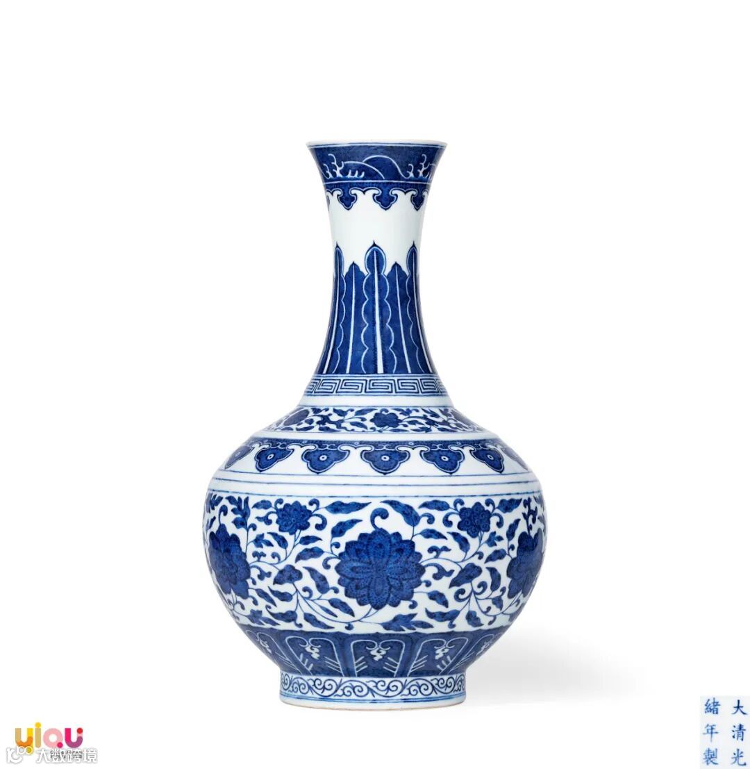 拍品造型挺拔秀丽,因其造型,而称为“棒槌瓶”、“纸棰瓶”,系在明代早期直颈执壶造型上,去流及柄而成型之品种,为清代官窑经典品类之一。全器内壁施白釉,外壁纹饰繁密,层次丰富,口沿绘卷草纹,其下绘以三组折枝牡丹纹图案;双台斜肩,分绘卷草纹与覆莲纹装饰;肩部下折,绘缠枝花卉纹胫部纹饰相互呼应,腹部绘花卉纹为主题,绘画笔触娴熟,青花苍雅深沉,可见永宣之风韵。圈足处亦绘卷草纹,与口沿、肩部的卷草纹上下呼应。全器制作规整,纹饰繁复,层次清晰,青花发色典雅,可为道光朝青花器之典范。