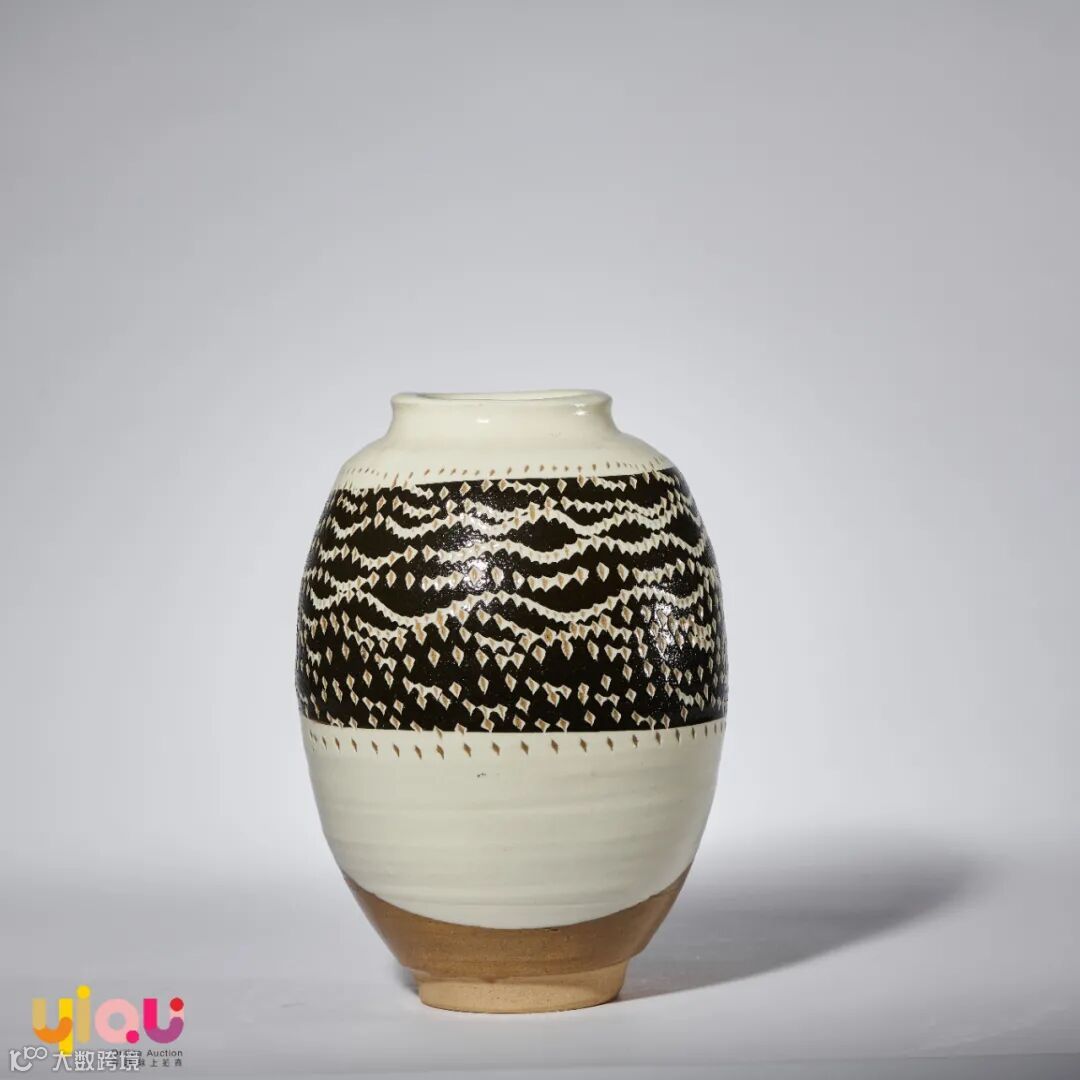 昭和时期,清水保孝制,飞白文花壶,高24cm。飞白文陶瓷是由日本陶瓷工匠借鉴中国古耀州黑陶的纹样发展而来,渐渐成为主流的陶瓷修饰手法。在黑白卦分两色的主体上,用剔、刻、嵌等手法,制作出颜色上的反差,从而达到修饰效果。清水保孝是这类技法运用的大师,保孝师承其父--人间国宝清水卯一先生,擅长青瓷、白瓷、柿釉、铁釉等多种陶瓷工艺,作品难得一见。