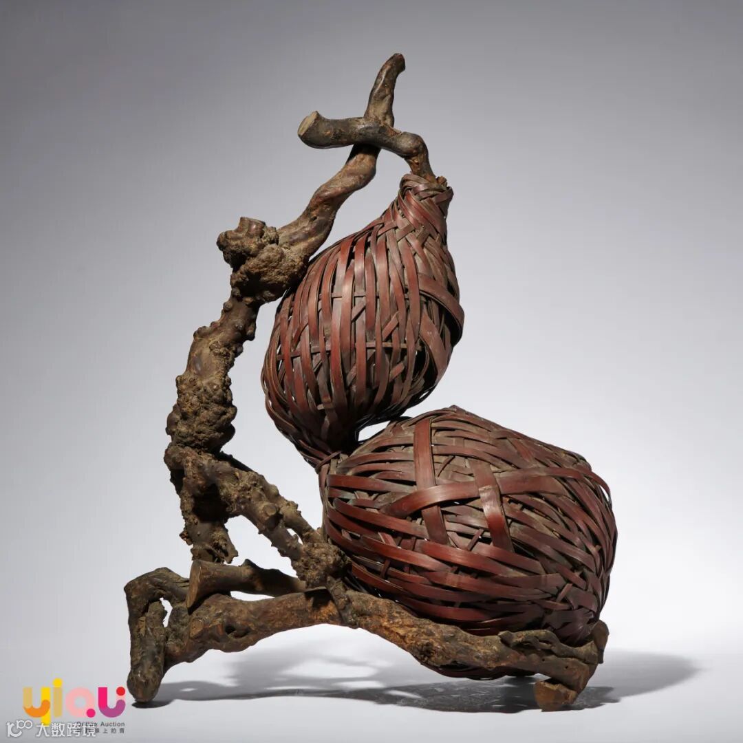 日本明治时期 大号葫芦型竹编花器,寓意福禄。边缘为天然留疤藤枝编制,百年光景,意境超然。