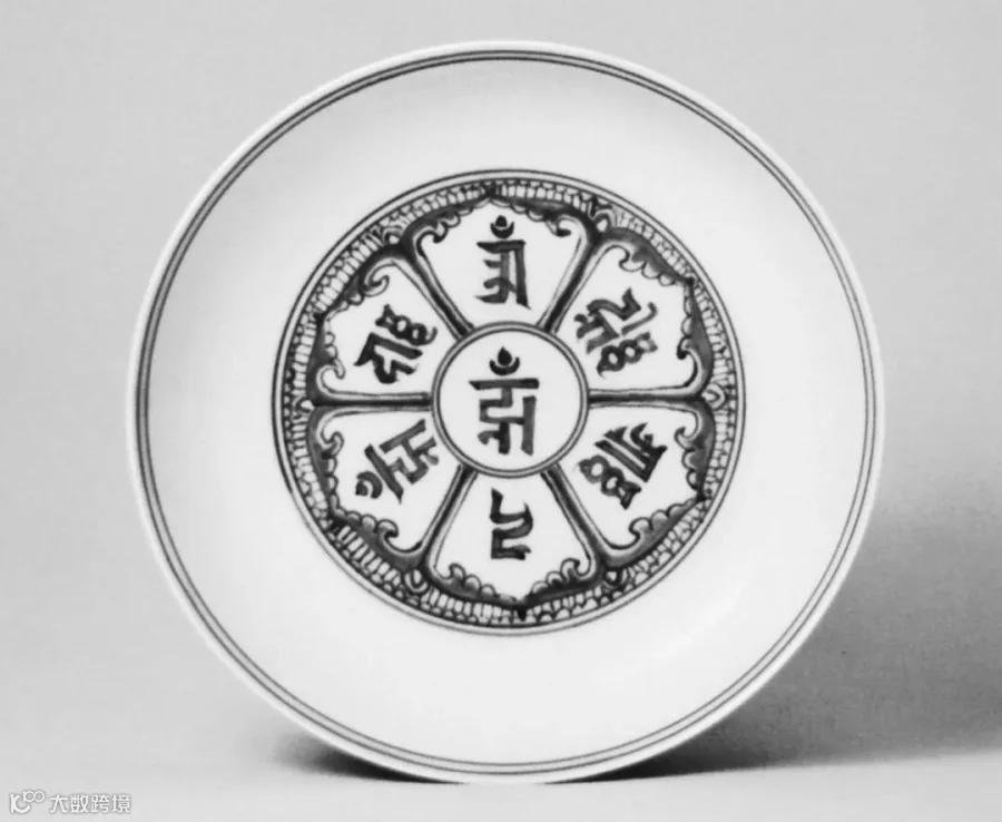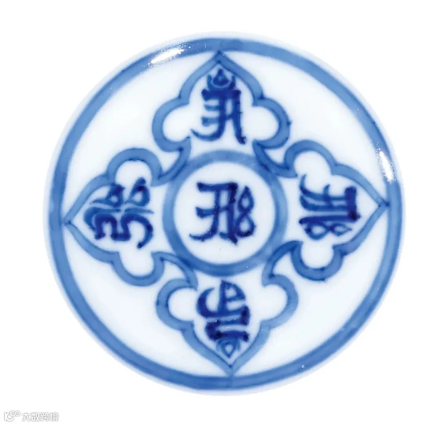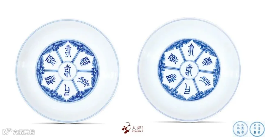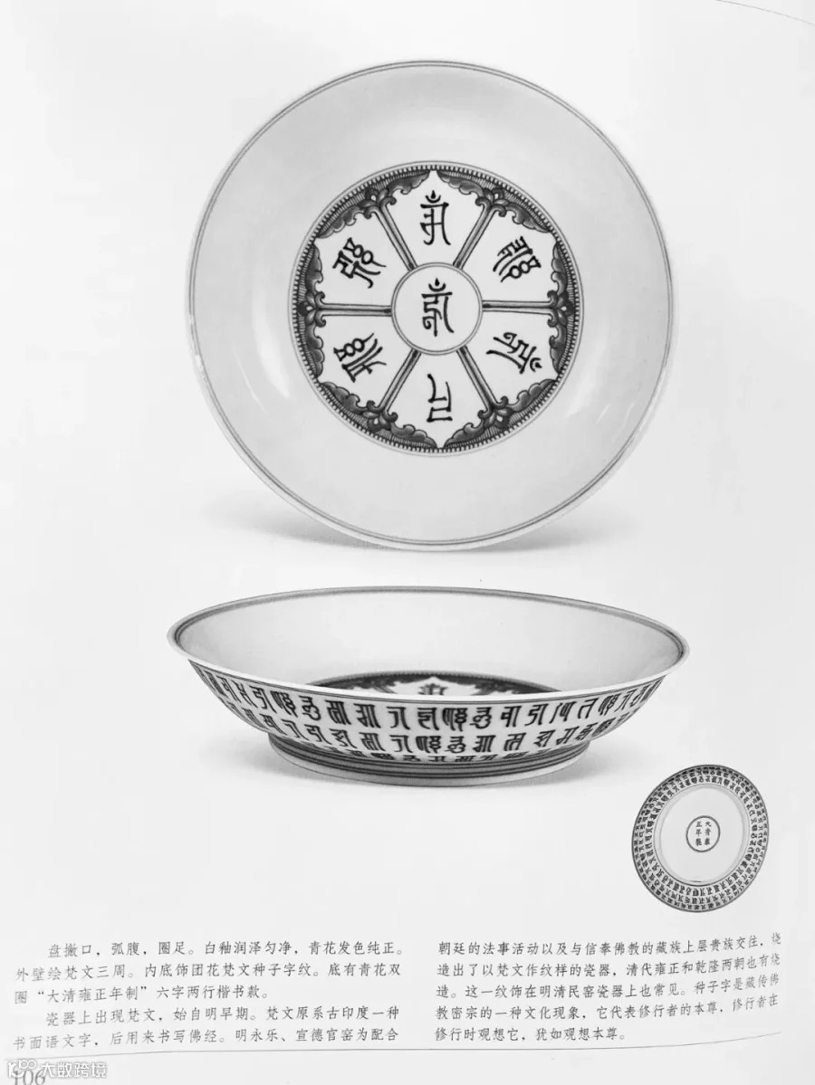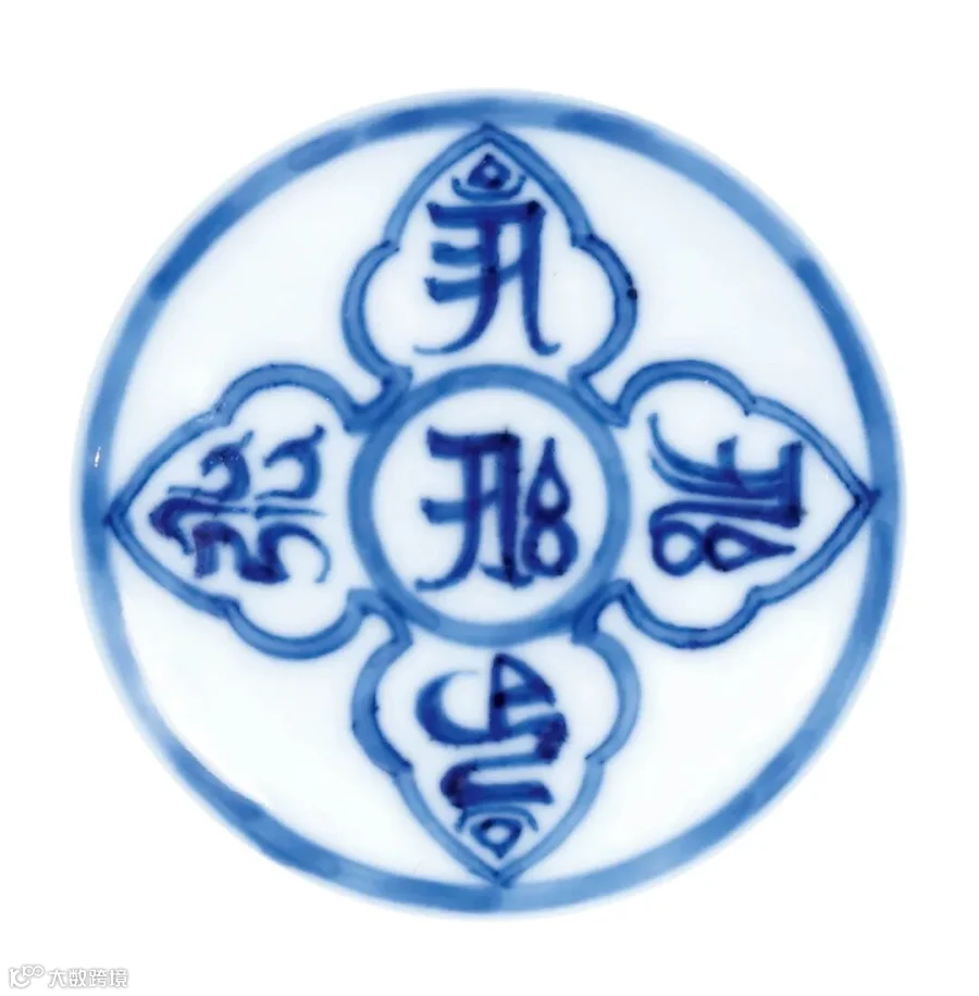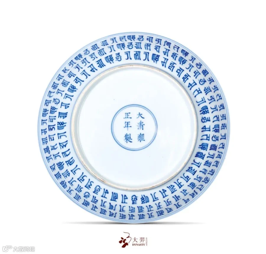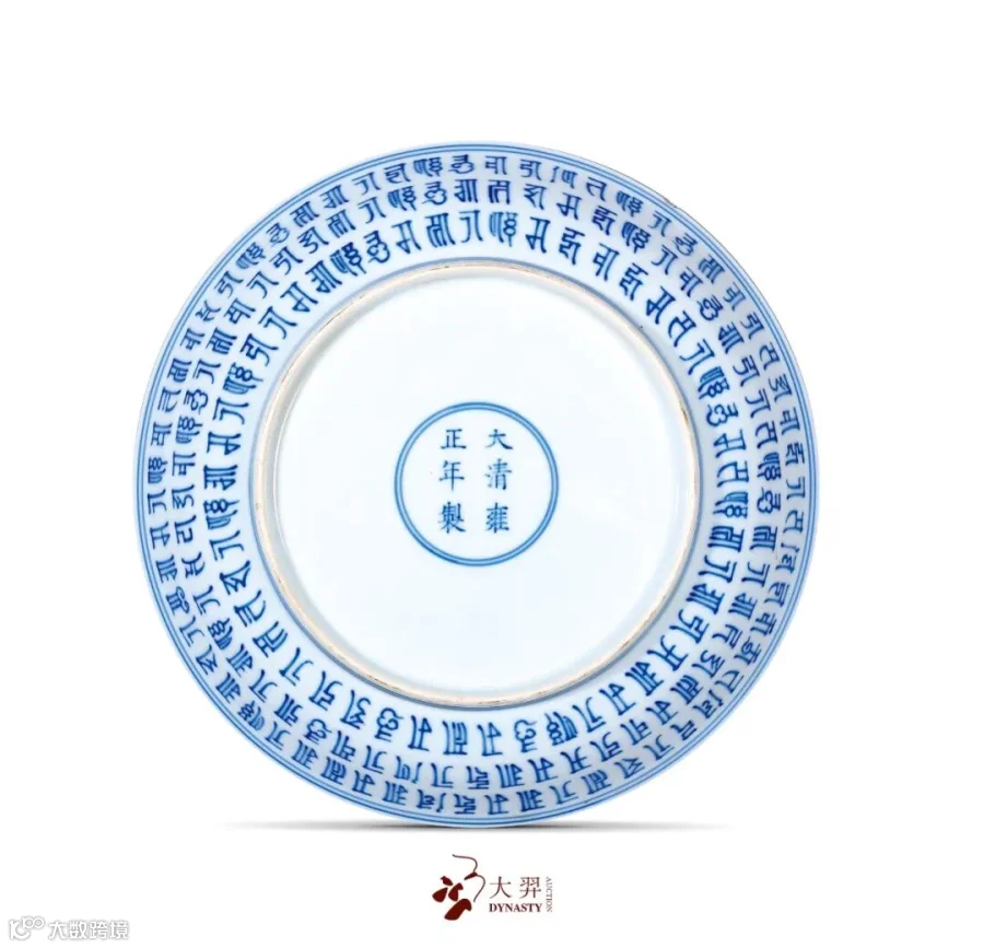 清初宫廷的宗教信仰与明初有着惊人的相似,皇室对藏传佛教的尊崇膜拜从而衍生出一系列装饰着密宗色彩的宫廷艺术品。此件雍正御窑所出青花梵文盘即为佛前盛装供品之用,其外壁绘青花梵文,内壁花瓣形开光内亦书青花梵文,外壁纹饰与盘心呼应,底部双青花线圈内书“大清雍正年制”六字双行楷书款,字体秀雅端庄。