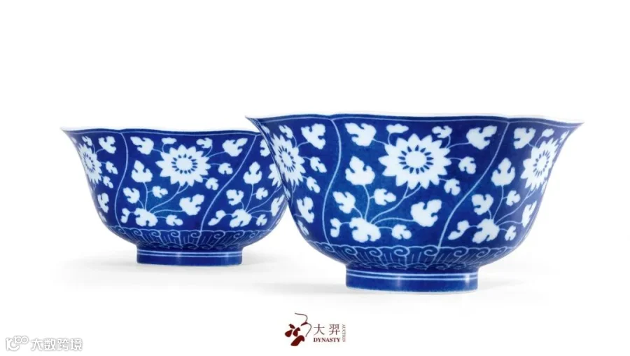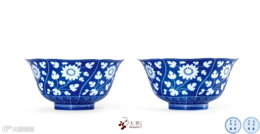 洒蓝地留白折枝花卉纹葵口碗一对 款识:“大清雍正年制”六字双行楷书款 直径:19.5 cm. 参阅:《玫茵堂藏中国陶瓷第二卷》,康蕊君,1994年,页192