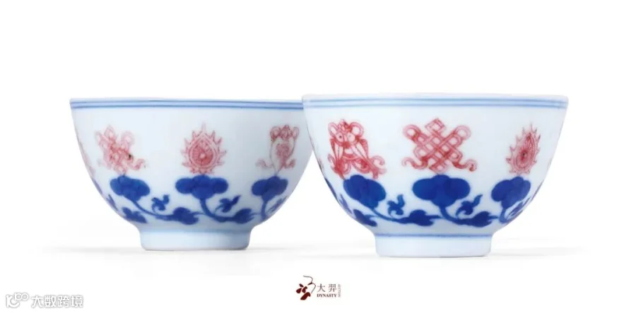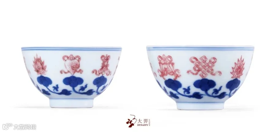 此套杯形小巧精致。胎体坚致,釉质细腻。杯外壁以青花绘缠枝莲纹,上托釉里红八宝纹,青花以平涂法绘就,八宝纹以线描勾勒,青花发色淡雅,釉里红发色周正。纹饰中的吉祥元素名为八吉祥,又称佛教八宝,由法轮、法螺、宝伞、白盖、莲花、宝瓶、金鱼、盘长结组成,象征佛教威力的八种物象,至清代时宗教意味已失,纯为祥瑞图案,甚或与道教纹样混淆。