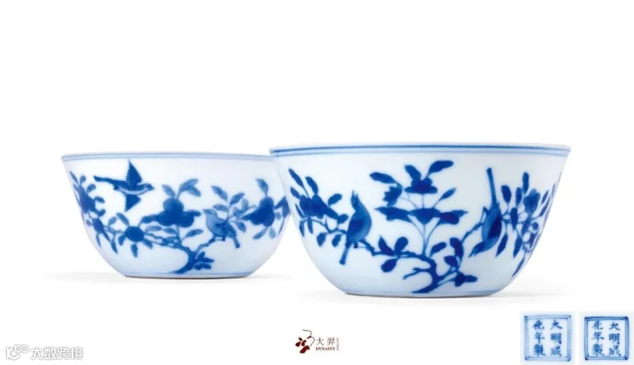 此对拍品口微侈,圆弧腹,及底内收,承接矮圈足,胎薄体轻,小巧可人。杯通体施白釉。釉汁洁白莹润,外璧口沿及胫部饰弦纹,碗心以青花绘莲托梵文。外壁以青花绘折枝花鸟纹,小鸟灵动活泼,花朵在枝叶的衬托下摇曳生姿。杯外底双方栏内青花书“大明成化年制”六字双行楷书款。款识字体俊秀,颇具成窑遗风。成窑小器备受雍正皇帝喜爱,御窑多有仿慕之作,本品便是其中佳品。