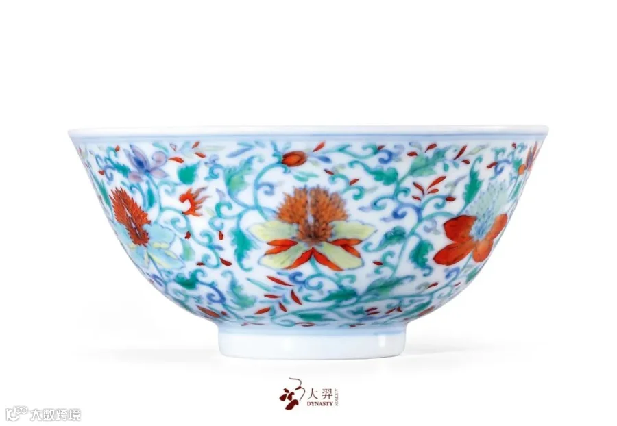 本品造型以成窑宫碗为摹本,线条柔美,其胎釉精良,温润似玉。雍正御窑斗彩瓷器,不但以仿古为能事,而且积极吸取借鉴西洋因素作为装饰主题,尤其喜爱运用当时欧洲流行的洛可哥手法表现西洋花草,从而开启御窑瓷器装饰的新风尚,此斗彩花卉碗即是体现此风尚的代表之一。