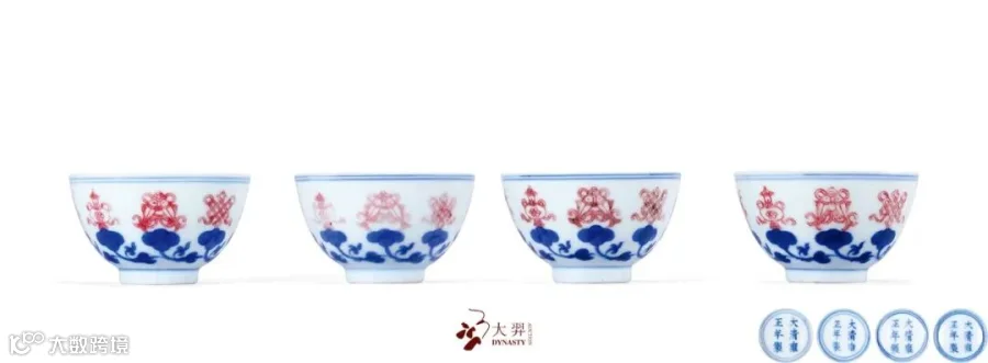 青花釉里红莲托八宝纹杯一组四只 款识:“大清雍正年制”六字双行楷书款 直径:6.5 cm.