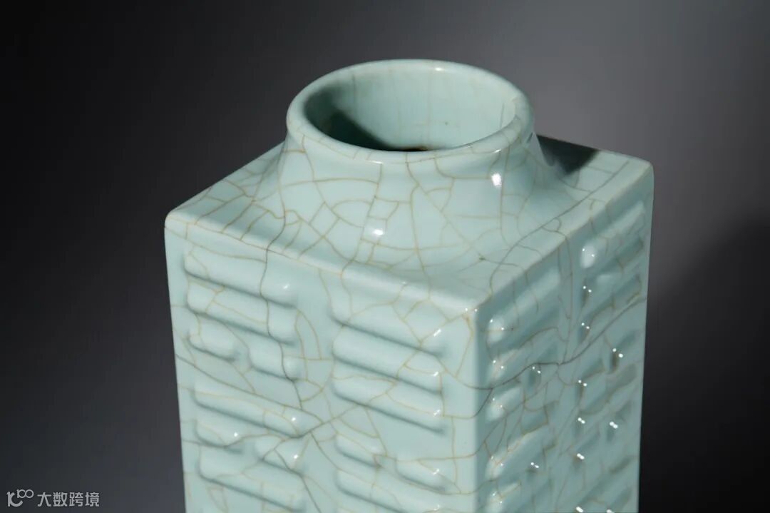 拍品圆口,短颈,平折肩,四方体,圈足。形制凝重敦厚,胎体厚实,腹部四面突起八卦纹,通体施粉青釉,色泽凝润,釉质肥厚,自然高雅,底落“大清同治年製”六字双行楷书款。琮式瓶为清代官窑的经典器型,其外壁有素面和堆贴八卦纹两种装饰之区别,此件拍品的装饰纹为后者,亦称“四方八卦瓶”,是从宋代起,仿照商、周玉琮加以变化而烧成的一种特殊器型,完全体现道教文化的精髓。