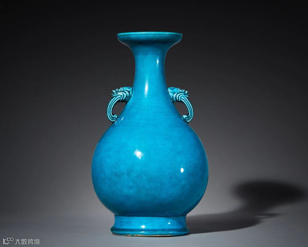 LOT13 清雍正 孔雀蓝釉双兽耳盘口尊