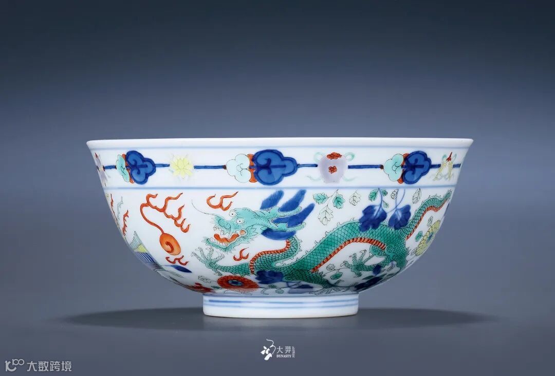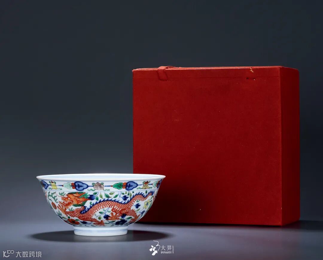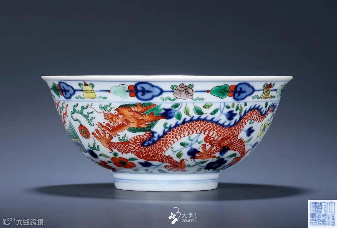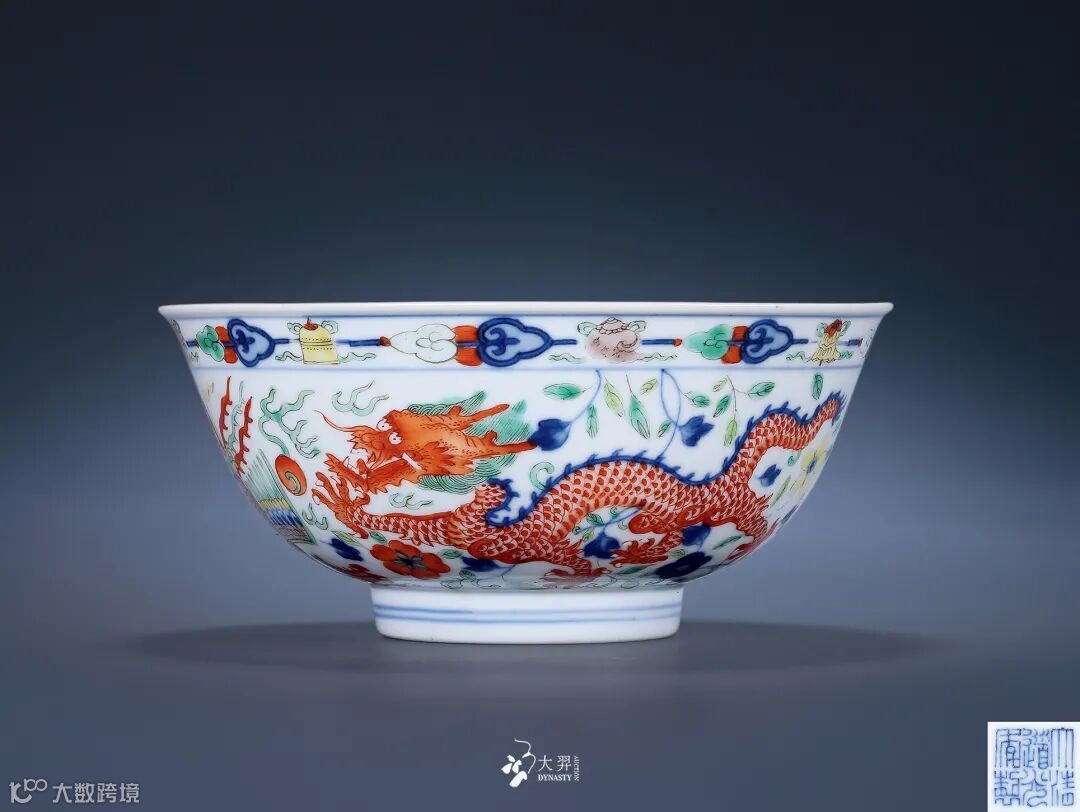 拍品侈口,弧腹较深,圈足。胎质细腻,釉质润泽, 釉面匀净。碗内底以红彩绘出五爪龙戏宝珠图案,龙 身周边青焰围绕,碗外部近口沿处以紫、黄、绿彩绘 一周八宝纹,以青花五彩绘出双龙双凤,基本呈中心 对称,双龙主体颜色分别以红、绿彩绘出,双凤振翅 凤首朝下,龙凤身边装饰以缠枝花卉,精美绝伦。龙 凤成双成对,寓意吉祥。此类碗始见自康熙朝,后成 官窑经典器型,每朝必烧,两百年来造型、纹样基本 保持不变。