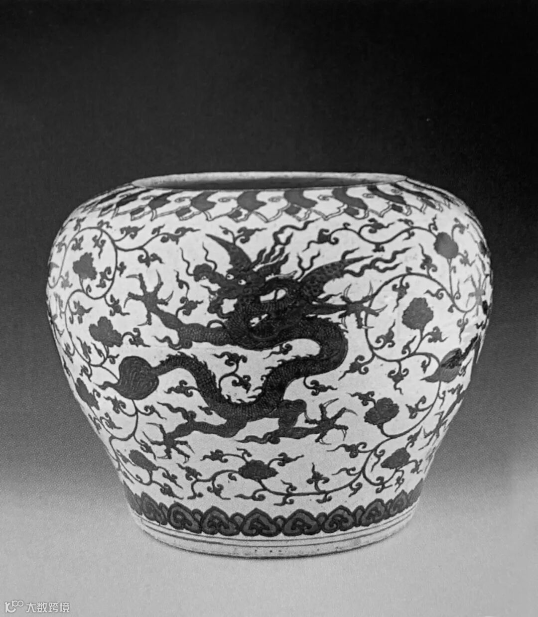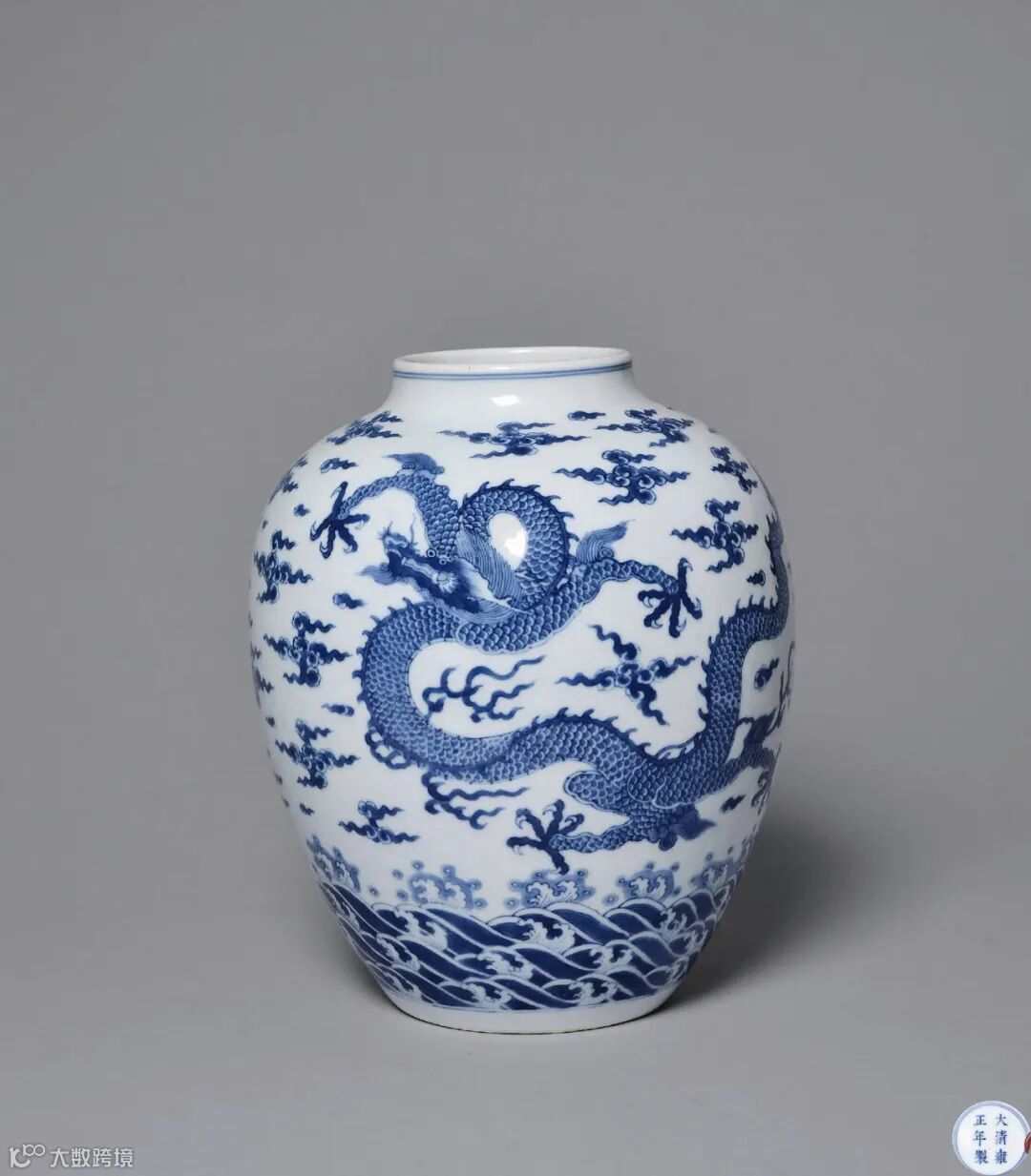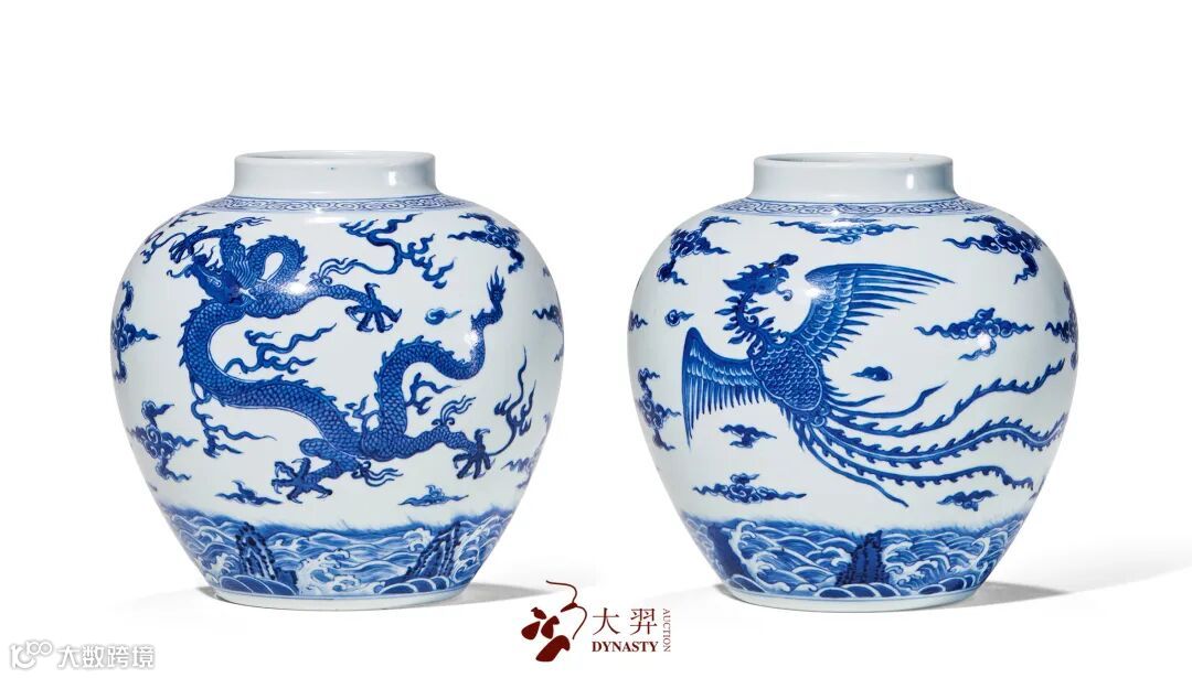 拍品为万曆时期罕见雄俊大器,传世极为少见,查阅国内外知名公私收藏机构资料,仅见大英博物馆藏形制、纹饰及尺寸与本品相同之万曆御窑青花大罐,除此之外,几未见其他相同器公开发表,且大英藏品罐口沿至颈部缺损磨失,本品保存完整,尤显珍贵,殊堪宝藏。拍品造型沉稳端庄,气势雄浑。器身通体青花为饰,腹部主题纹饰绘四条五爪威猛翼龙穿翔于缠枝花叶间,身形矫健,气势凶猛,鼻部前突呈如意形;龙眼圆睁,眼白面积多;龙爪壮如车轮,凶悍有力;花叶勾连翻卷,形状近似如意头状,风格别具,十分少见。整器纹饰布局层次分明,繁而不乱,青花发色浓郁艳丽,蓝中泛紫,“回青”钴料呈色十分明显,时代特征鲜明,可谓罕见万曆御窑精品大器、青花杰作。