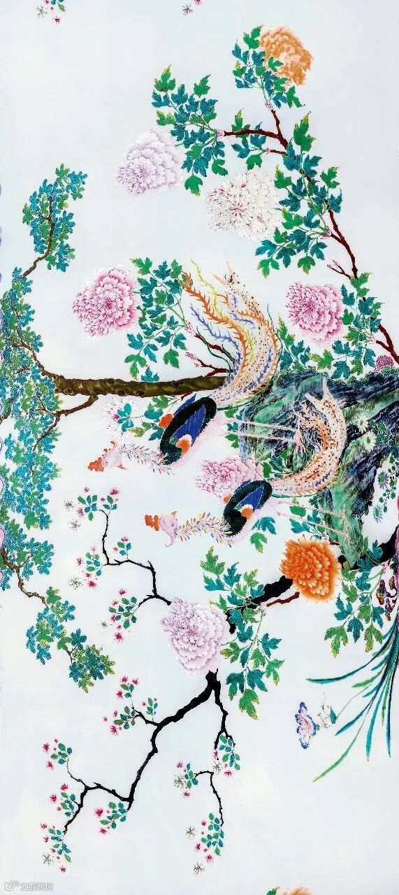 乾隆一朝堪称中国彩瓷历史之巅峰时代,其彩釉之丰富,品类之繁复,技术之高超,皆空前绝后,此时极良工巧匠之能事,依遵乾隆皇帝之广博爱好,以瓷为胎,敷设彩釉,水平之高令人叹为观止。乾隆一朝,文化艺术得到长足发展,加之综合了康雍两朝的制瓷工艺,乾隆朝对粉彩器物的用途、形体、花纹的要求常有御旨,此瓶即为宫廷定烧的粉彩器物,为官窑珍品。瓶撇口,束颈,长圆腹,圈足。拍品绘凤凰成对,立于石上,花丛风景自然可爱,匠意慕古求新,画工精致写实,凤凰羽毛纤毫立现,山石棱角分明,明暗有致,牡丹盛开,锦绣成团。瓶身硕大,线条流畅,外壁妙绘通景和鸣凤鸾,犹如画卷除除展开。吉祥图案是陶瓷装饰的主要内容,清代瓷绘更是“图必有意,意必吉祥”。