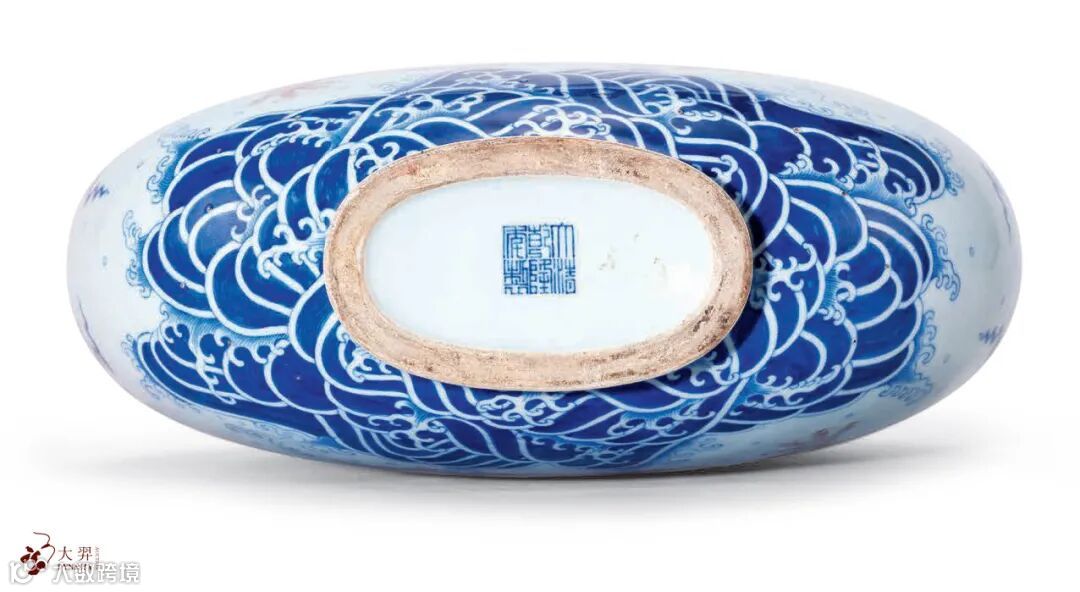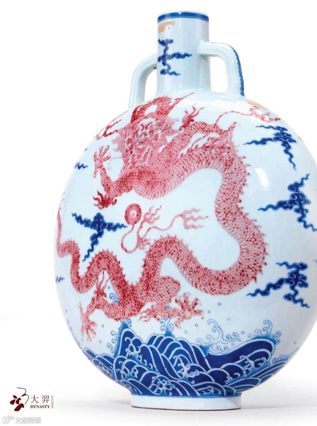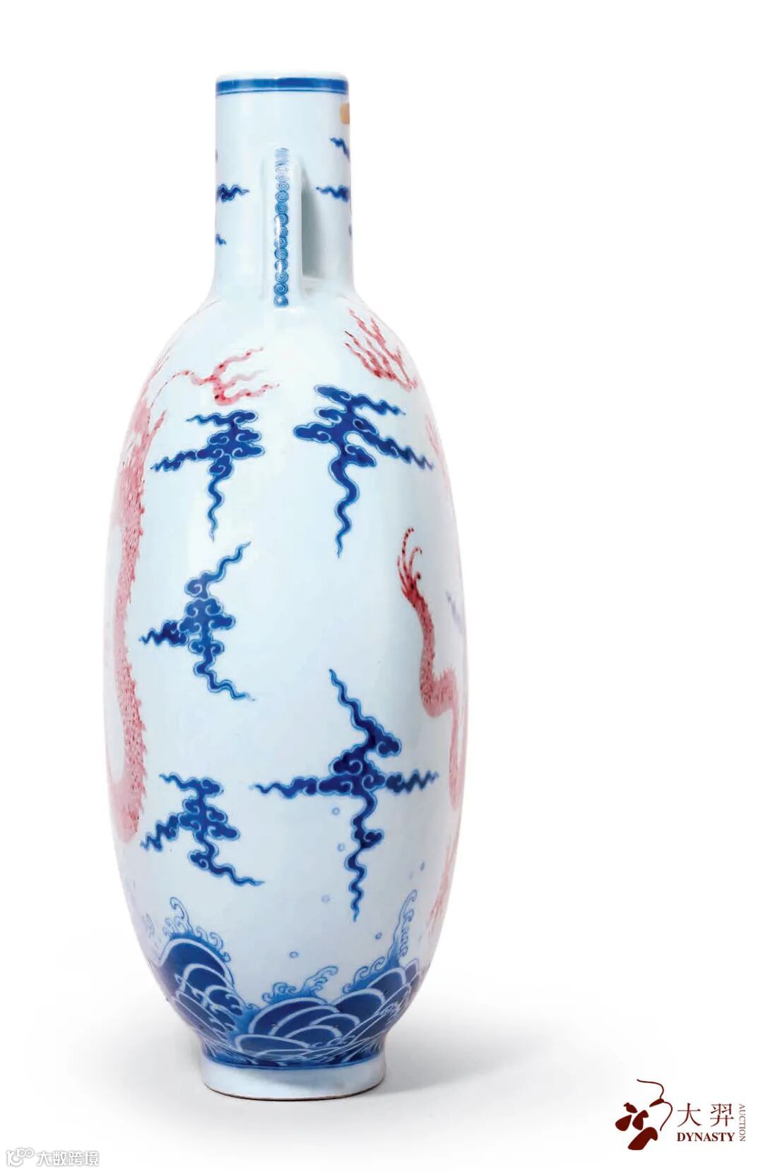 青花釉里红海水龙纹抱月瓶 款识:“大清乾隆年制”六字三行篆书款 高:38.8 cm. 来源:上海重要私人藏家陈俊荪家族旧藏 参阅: 1、《故宫博物院藏文物珍品大系——青花釉里红(下)》,上海科学技术出版社,2000年,页233,图213 2、《徐氏艺术馆・陶瓷IV・清代》,徐氏艺术馆,1995年,图84