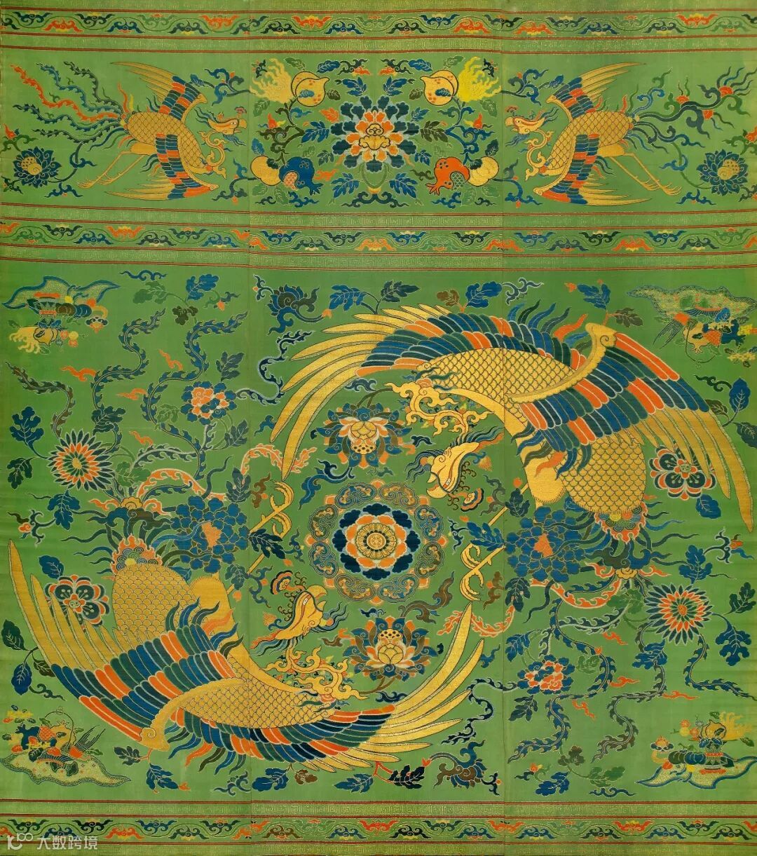 此帐呈正方形。绿色素缎为面,居中绣凤凰追逐为主体。凤凰嬉戏成团,凤身环绕各式花卉,以表吉祥安泰。选料上乘,绣工规整,配色和谐富丽。拍品纹饰与北京保利2017年秋拍拍品Lot5178御制黄花梨鸾凤牡丹纹大顶箱柜之凤纹十分接近,可证为同一时代作品。