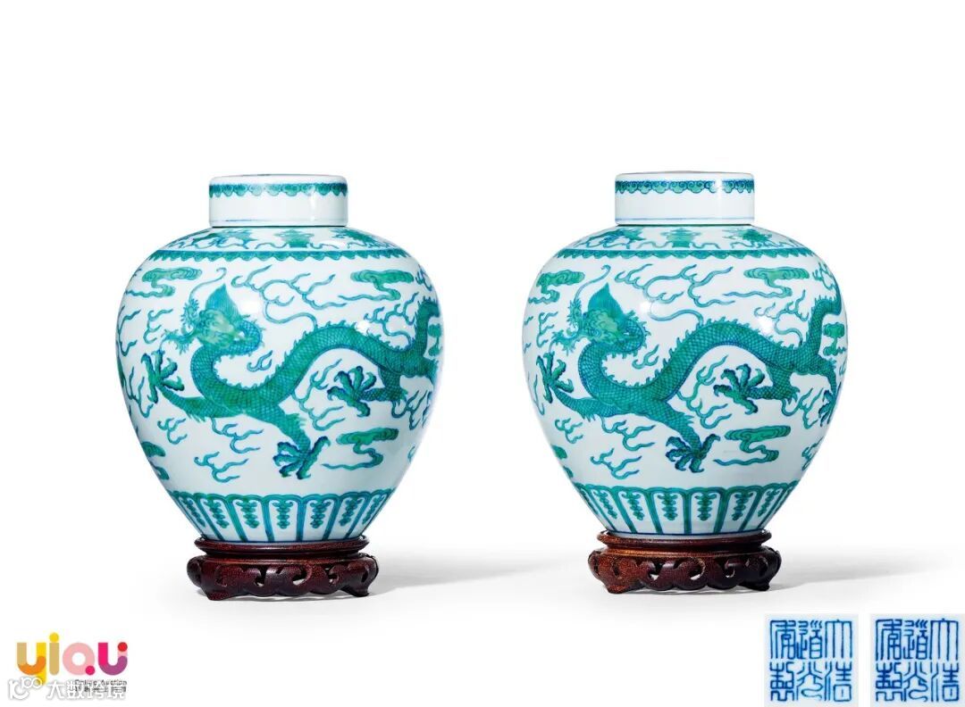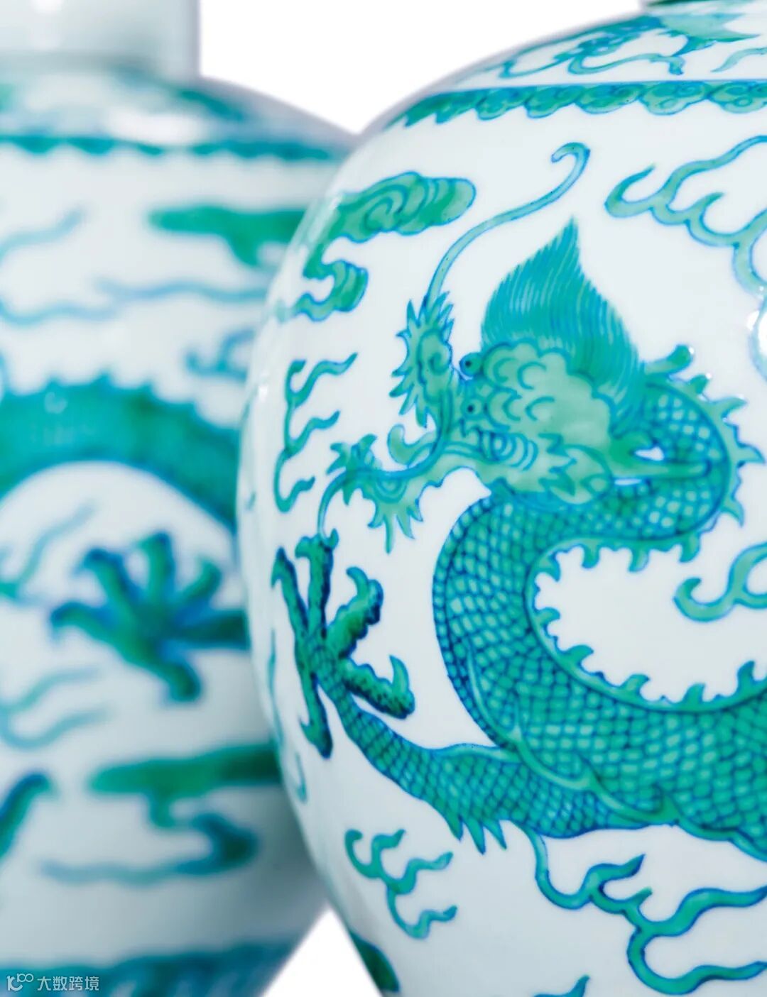 此对盖罐圆口,直颈,丰肩硕腹,至底内收,浅圈足,形制规整,制作精细,附平顶圆盖,子母口。内施白釉,外白地,胎釉温润,通体纹饰均在釉下以青花勾勒轮廓线,釉上绿彩描绘,蓝线绿彩,给人以清新雅丽之感。此罐以三层纹饰装饰,腹部主题纹饰为双龙纹,呈追逐戏珠状,隙地饰云纹,龙纹苍劲有力;肩、胫部分别绘八吉祥及变体莲瓣纹,底部青花书“大清道光年制”六字三行篆书款。在青花勾线内以一色绿彩填绘的工艺是斗彩的一种装饰,始见于明成化朝,传世有成化卷枝纹瓶和云龙纹盘。清代烧制的绿彩斗彩器以云龙纹盖罐最为典型,并以此为固定模式从清康熙至以后各朝历代相传,仅形制略有变化。