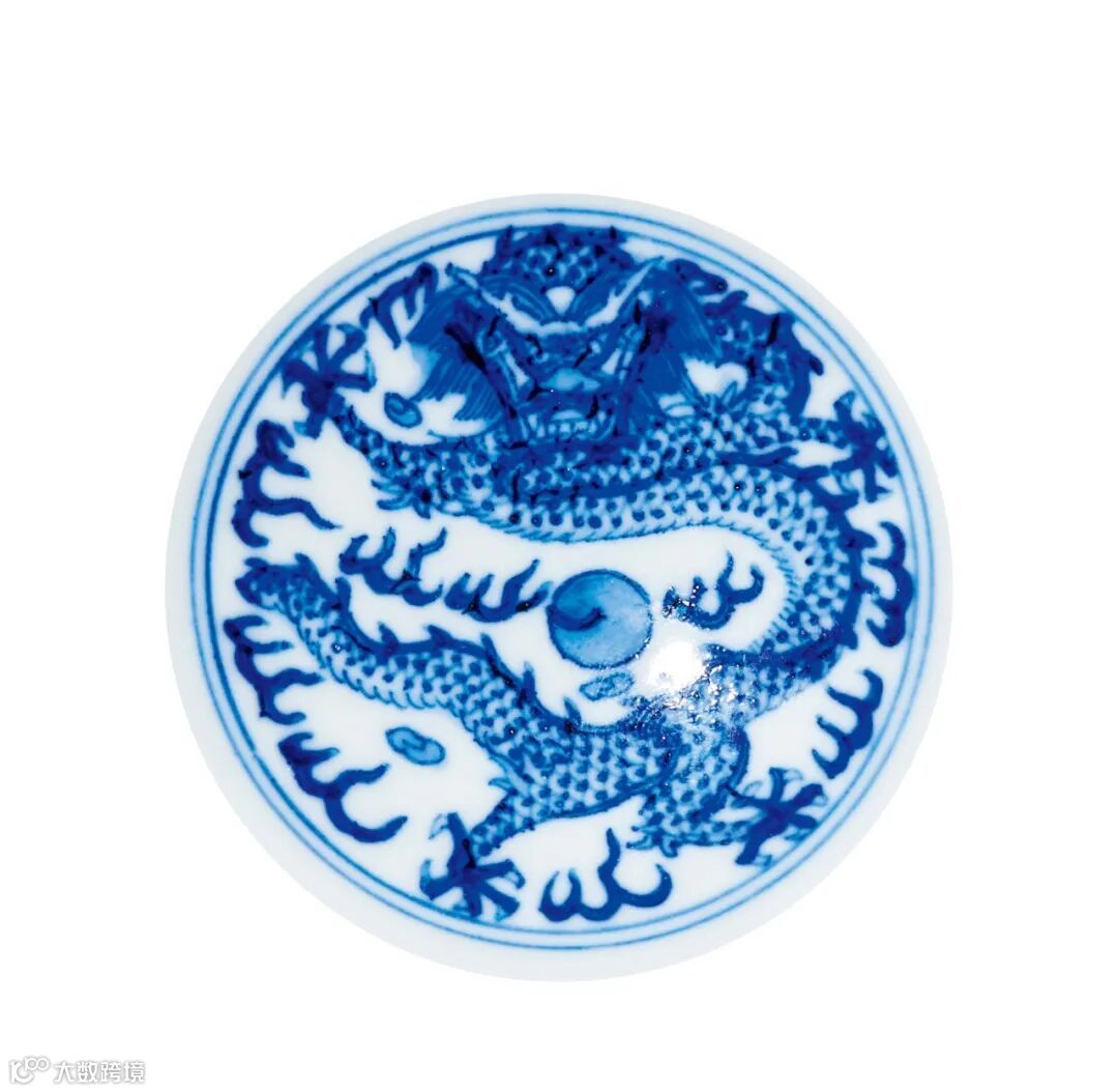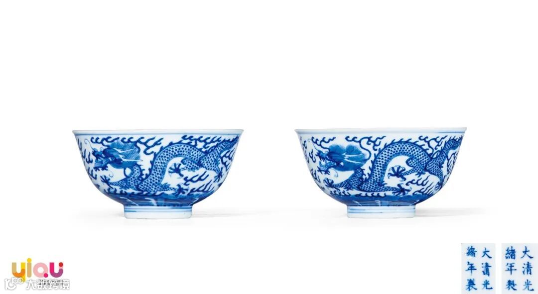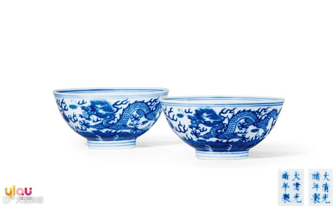 此对拍品撇口,深弧腹,圈足。碗外壁以青花绘云龙纹,二龙龙眼圆瞪,张口露齿,健步如飞。龙须向两侧伸展,龙身曲折,其间点缀云纹,更增添了行龙的动感;龙嘴大开,欲争抢前方的明珠,情势生动。龙身下部绘海涛纹,海浪汹涌,浪花四溅,观者似能听到海浪拍打的声音,进一步渲染了两龙争珠紧张激烈的态势。碗造型小巧,做工精细,云龙描画传神,小器大样,颇显皇家风范。