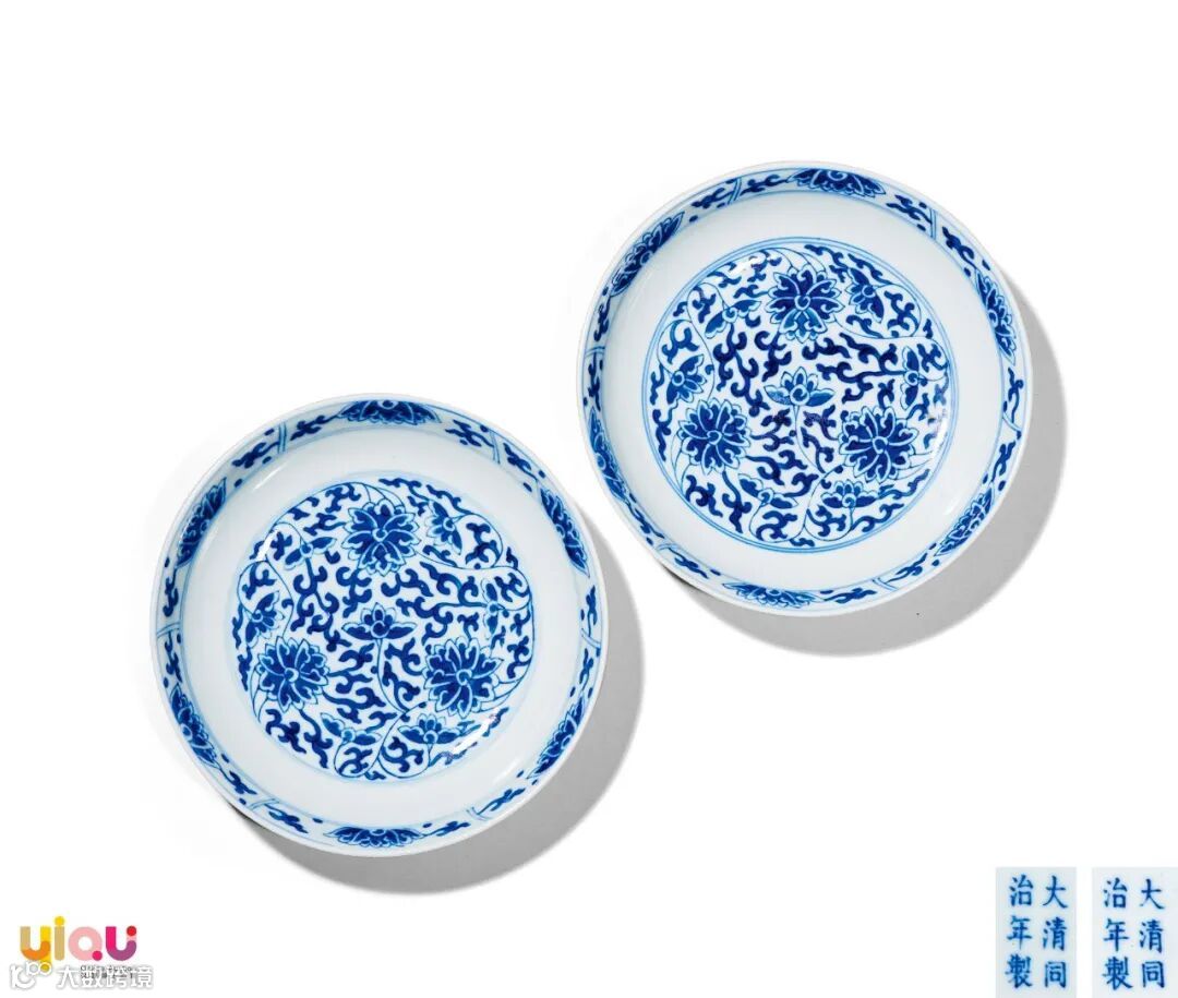 此盘成对,敞口,浅弧腹,圈足。盘通体白地青花装饰,盘心及内外壁均饰青花缠枝莲纹,外底青花书“大清同治年制”六字双行楷书款。造型规整,胎质洁白,釉质莹润,青料发色艳丽,青花绘莲纹,寓意“清廉”。该盘工艺精湛,绘画精细,款识工整,是清代同治官窑的典型器物。