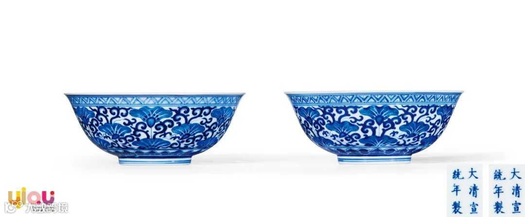 此对拍品敞口,深弧腹,圈足。足脊露胎圆润,切削细致,胎质洁白细糯,碗体轻盈,造型规整。碗体里外密布装饰纹样。内里口沿饰锦地方形纹一周;内壁及内底心饰碎点地衬托的如意头连接的留白花纹,以缠枝纹带间隔。外壁的主题纹样是缠枝花卉纹,绘工精细,意趣盎然。外口沿及胫部的辅助纹样分别是一周连续的三角加点纹和如意头莲瓣纹。纹样布局合理,繁密疏朗有致。满施白釉,釉汁莹润,釉面平滑。青花色泽亮丽,鲜艳柔美;深浓浅淡分明,阴阳有别;绘画笔触细致,纹饰精细;画面生动活泼,充满生机。底落“大清宣统年制”六字双行楷书款。