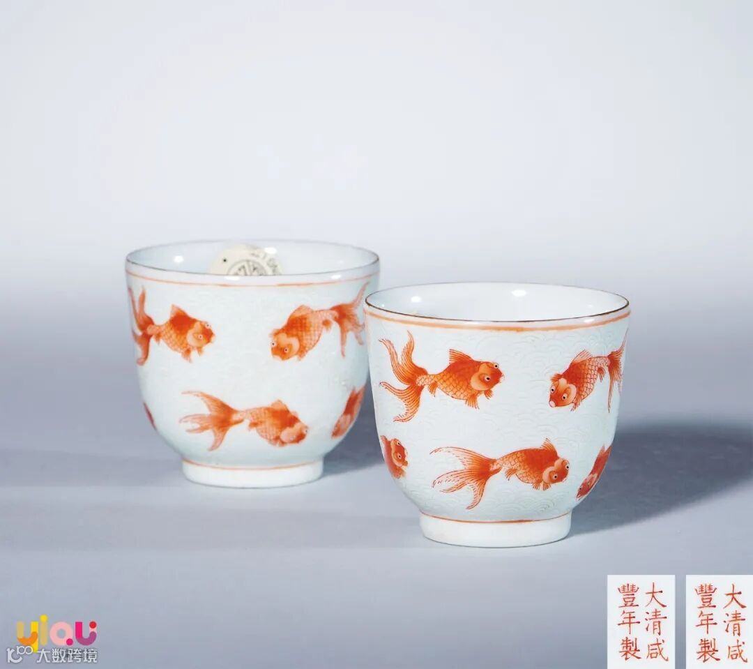 此对拍品敞口,弧腹,圈足。足脊露胎,胎质圆滑细腻,器底书“大清咸丰年制”六字双行楷书。通体施以闪青白釉。此对外壁满刻暗波,釉上绘有红彩金鱼,造型灵动,逼真,色彩鲜丽,宛如游戈于荡漾的水波中。在配色上,红金鱼与晶莹滋润的白色水波纹形成对比,给人以清丽幽雅、生趣盎然之感。