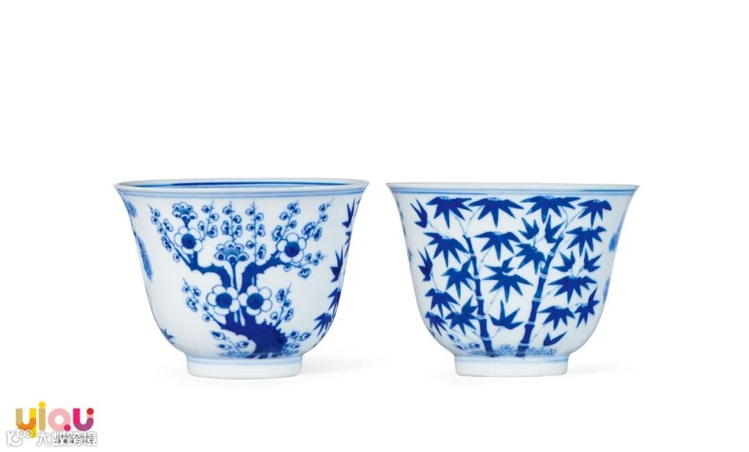 此对拍品撇口,深弧腹,圈足。造型端庄,胎体细腻,施釉莹润。杯身外壁以青花绘岁寒三友图,画意清高,布局饱满,笔触精道。岁寒三友是明清官窑的传统纹饰,以其岁寒不凋的特性,比兴君子坚贞之德,而受到历代帝王的喜爱。青花发色浓淡相宜,极为惹喜,成对保存,极为难得。