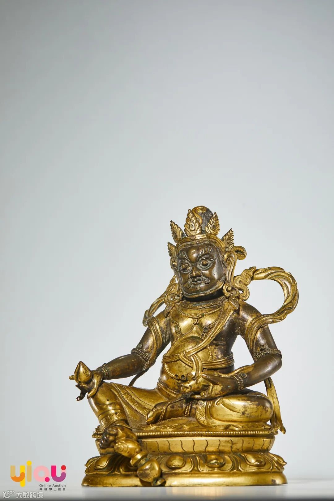 此尊黄财神,一面二臂,面庞丰腴,五官精致,身形饱满大气,头顶精美的五叶宝冠,锋利挺拔,宝严加顶,金水莹亮,身披帔帛,灵动飘逸,华丽多姿。衣着及冠饰刻绘秀美规整,雍容华贵之气溢于言表,具有鲜明的清乾隆时代特征。黄财神腹圆敦实,双臂劲力,颇为健硕。身披璎珞,手、臂及踝处饰有精致钏环,天衣绕体,线条过渡自然,富有丝绸的质感。下身着短裙,左手握的吐宝鼠于左膝之上象征财富不断,右手握如意宝珠,财神以如意坐姿右足轻踏海螺宝瓶,坐于莲座之上,气势十足!值得关注的是,吐宝鼠面部写实、鬃发分明,即小见大,足可见整像做工之精湛。衣褶层层堆叠于宝座之上,层次分明,极为立体,力度十足。黄财神是生意人必不可少的供奉题材,将为您带去无尽的财富与功德。此尊造像历经岁月洗礼,仍保留有明丽的金水,如此动势与威武之气势更是极为难得,不容错过。
