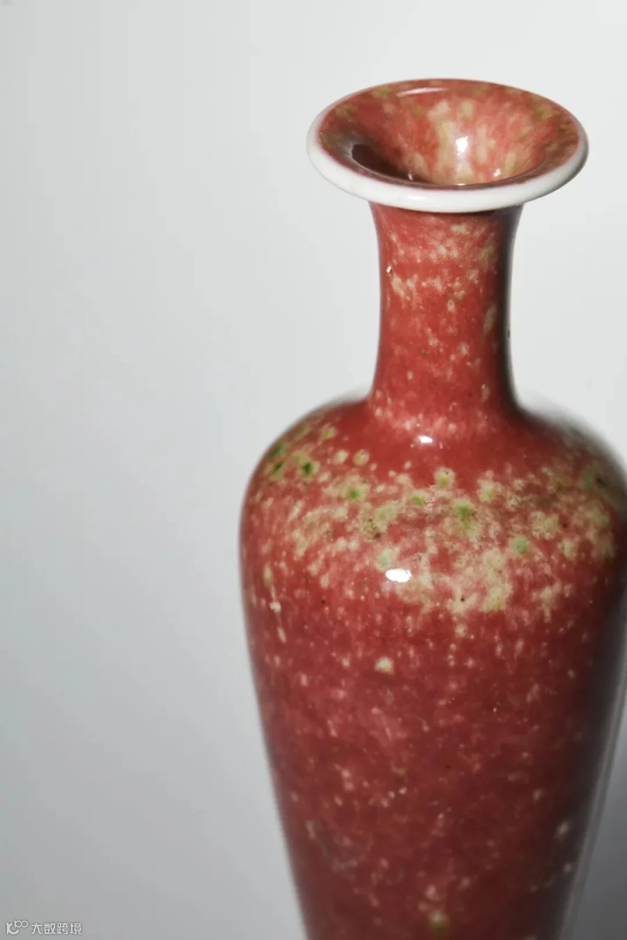 豇豆红釉为康熙年间仿明宣德的铜红釉品种,色如豇豆皮,故得名。其色调淡雅,“红似朝霞欲上时”。初期因烧制难度很大,故而仅限有文房小件器物为主,后世多有仿烧,本品即为其中佳例,造型纤细似柳叶,故有“柳叶瓶”之称,又因隽巧秀美宛如亭亭玉立之佳人,又称之为“美人肩”。器底挖足甚深,施白釉,内青花书“大清康熙年制”六字楷书款,通体罩施豇豆红釉,淡雅的红色中掺杂淡色斑点,甚为柔和悦目。