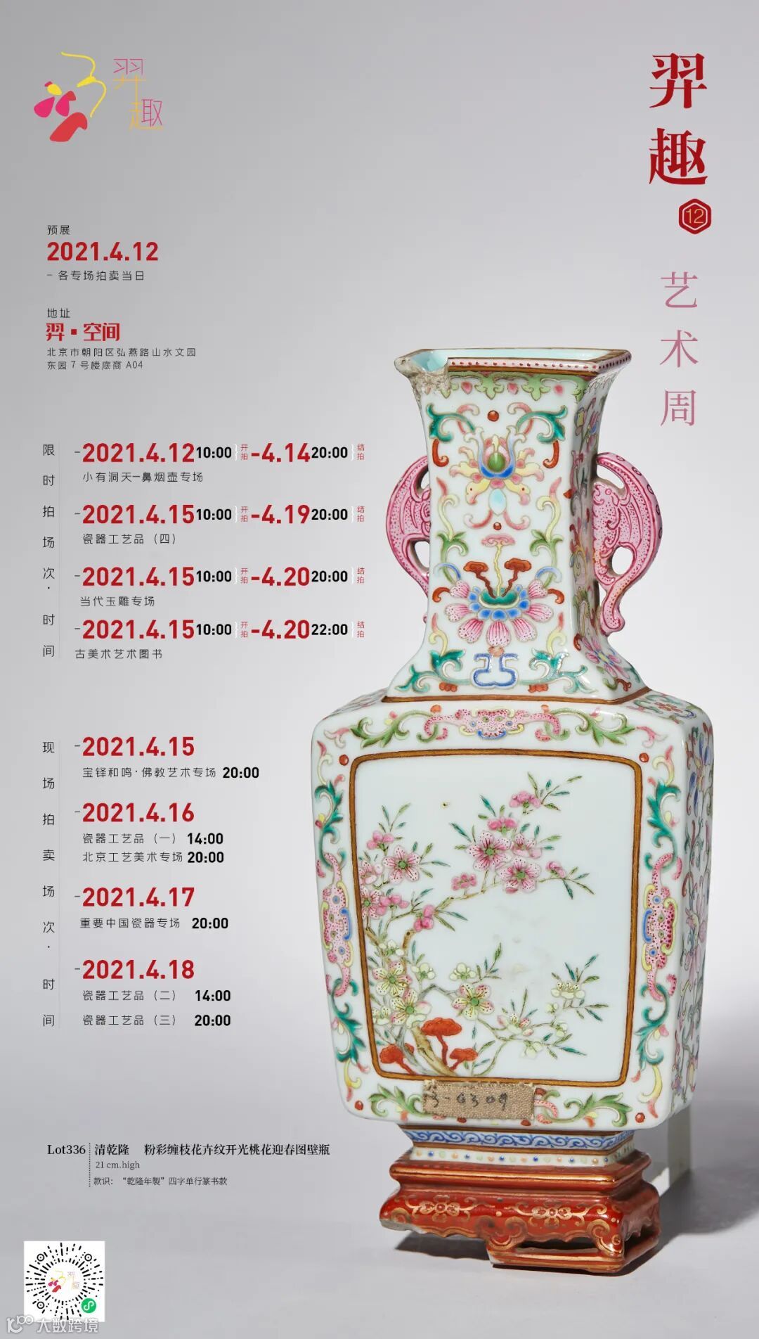 羿趣12·艺术周还有3个限时拍专场将继续拍卖,“瓷器工艺品㈣” 将于4月19日 20:00截拍,“当代玉雕”专场和“古美术艺术图书”将于4月20日20:00截拍,我们热诚期待您的参与。