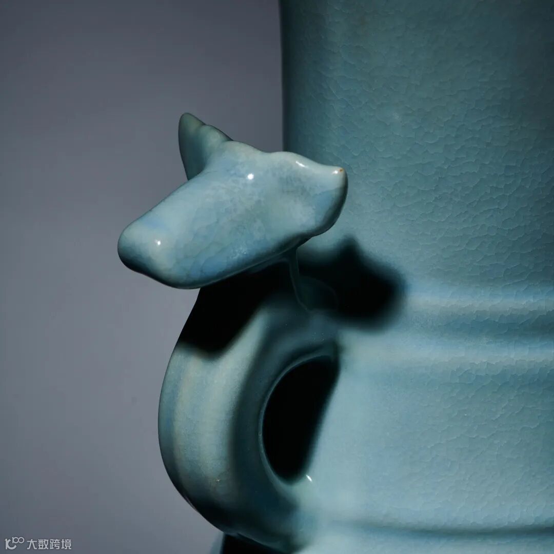 与本件拍品类似同时具有挺拔端庄的线条,以及龙纹装饰的瓷器,可参照佳士得2022年以港币8106万成交的清乾隆粉青釉雕海水龙纹梅瓶。这种张弛有度、曼妙无比的轮廓与深浅有致的纹饰搭配,可谓天衣无缝。