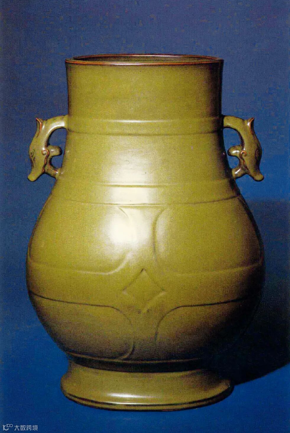 本拍品直口,溜肩,圆鼓腹,圈足外撇。造型仿青铜器而作,颈部设出戟,肩部对称贴塑双牺耳,腹部模印十字穿带纹,并于中心作几何状凸起,造型浑厚古朴,胎体厚重坚实。