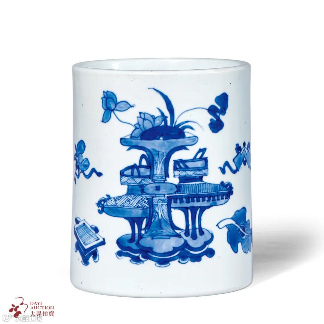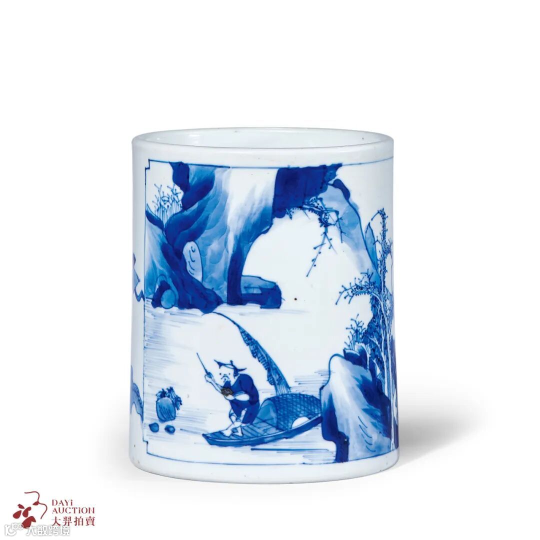 这只清康熙 青花渔父图笔筒直口筒腹,口底相若,周正典雅,被马钱特家族收藏后,2019年10月8日释出于香港佳士得。内壁施白釉,光素匀洁,外壁以青花为饰,一侧开光内绘渔父图,渔父撑船漫游江上,水流潺潺,惬意悠然,奇石、近水、浮草纵斜生长,意境悠远空灵。另侧绘博古图,陈供书籍画卷、香几香炉等。整体构图疏朗有致,绘画工整,青花发色淡雅清新,层次分明,实为康熙时期青花文房佳器。