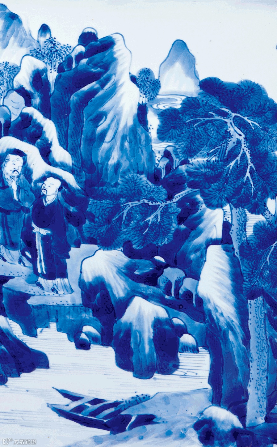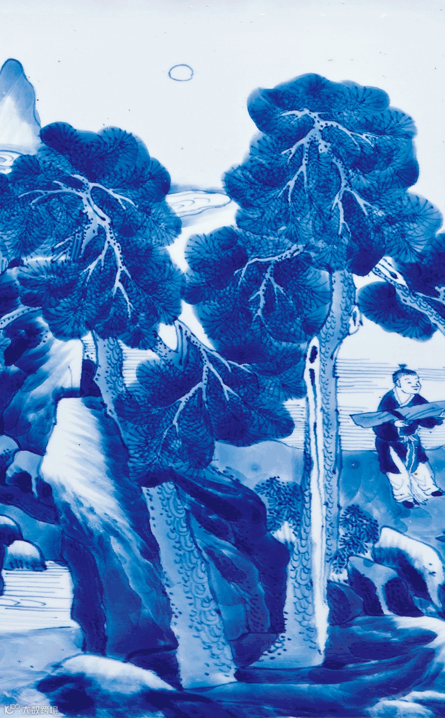 此品通体以青花装饰,颈部绘如意纹及回纹,瓶腹绘通景山水人物图,重山耸立,松林葱郁,山路逶迤,亭阁掩映其间,高仕漫游,渔夫泛舟,江波粼粼,湖光潋滟。画中山石层层皴染,人物悠游自乐,尽显士大夫避世隐逸的生活情趣。