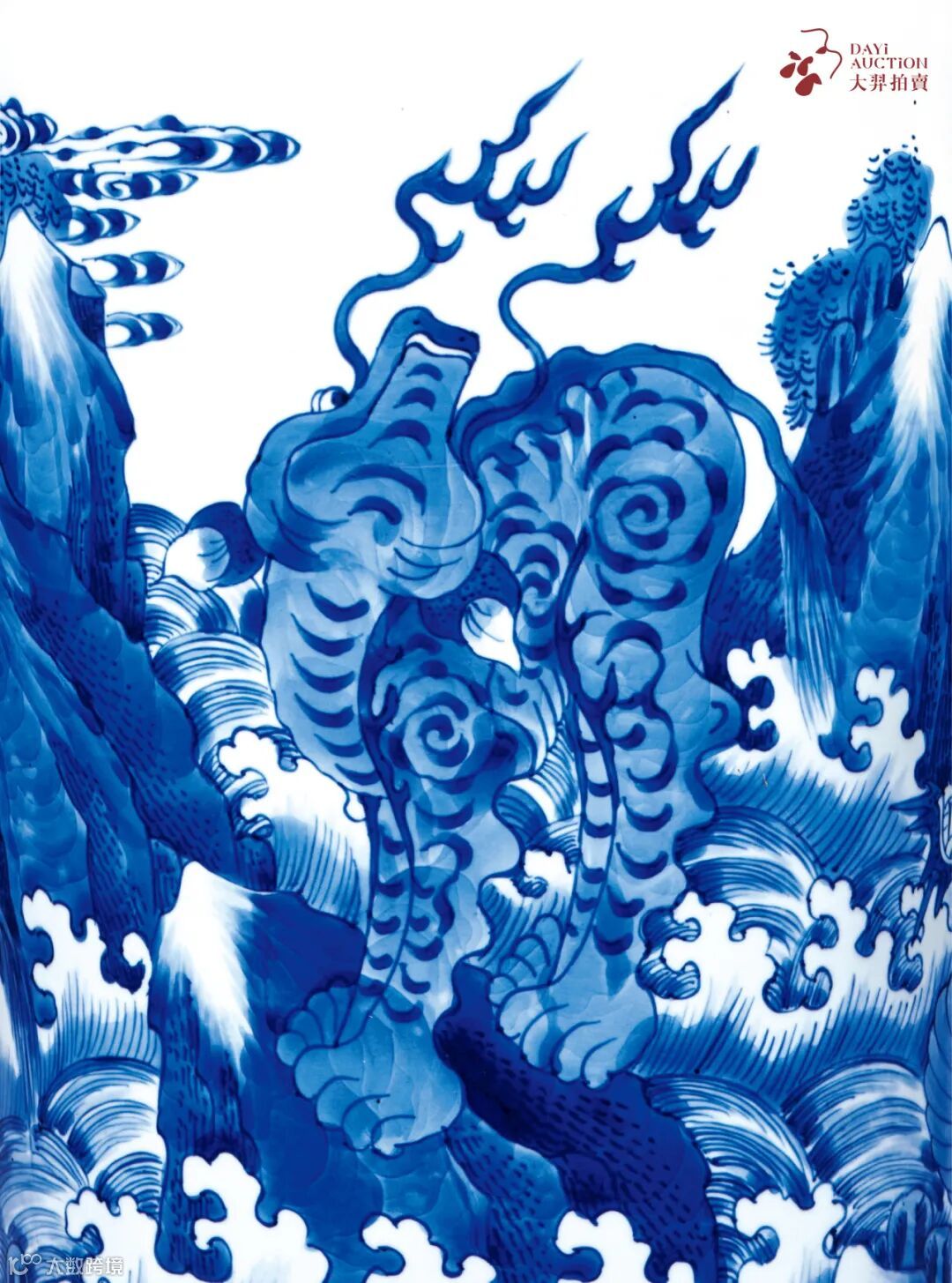 腹部通景绘海水瑞兽纹,瑞兽立于海岩之上,气势凶猛,身姿雄健,神采飞扬,周身云气飘渺,海浪涛涛,山石嶙峋屹立。整体用笔流畅,画面布局清晰,笔触皴染得宜,青花发色苍翠浓妍,当为康熙青花之典范。