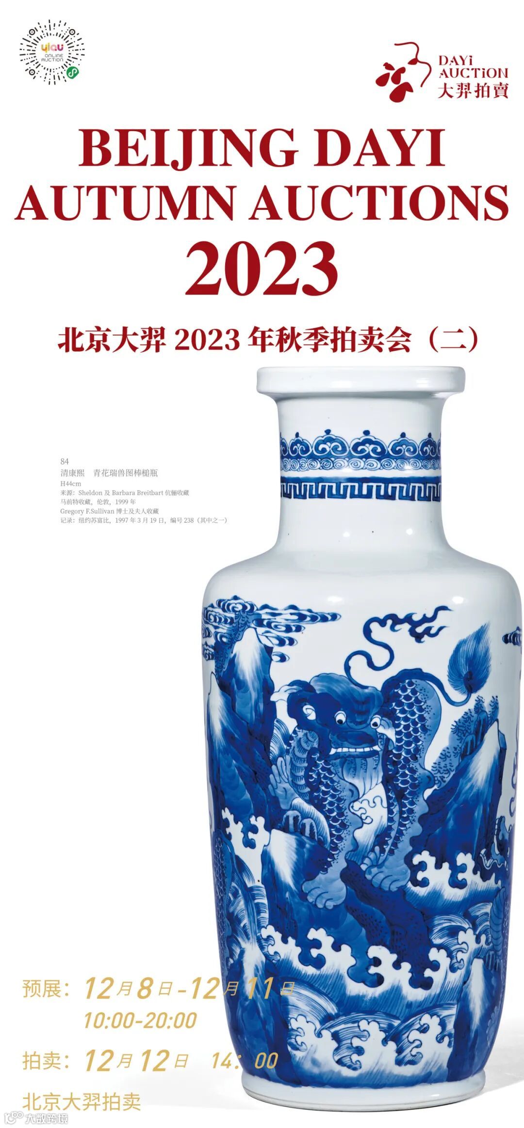 经过精心筹备,北京大羿2023年秋季拍卖会(二)即将于12月8日拉开帷幕,一场丰富多彩、满目琳琅的艺术盛宴即将上演。12月12日下午14:00举槌拍卖。是次,我们会以卓越的品质和专业的服务,恭候各位莅临秋拍(二)预展现场,为各位展现目不暇接的明清瓷器。